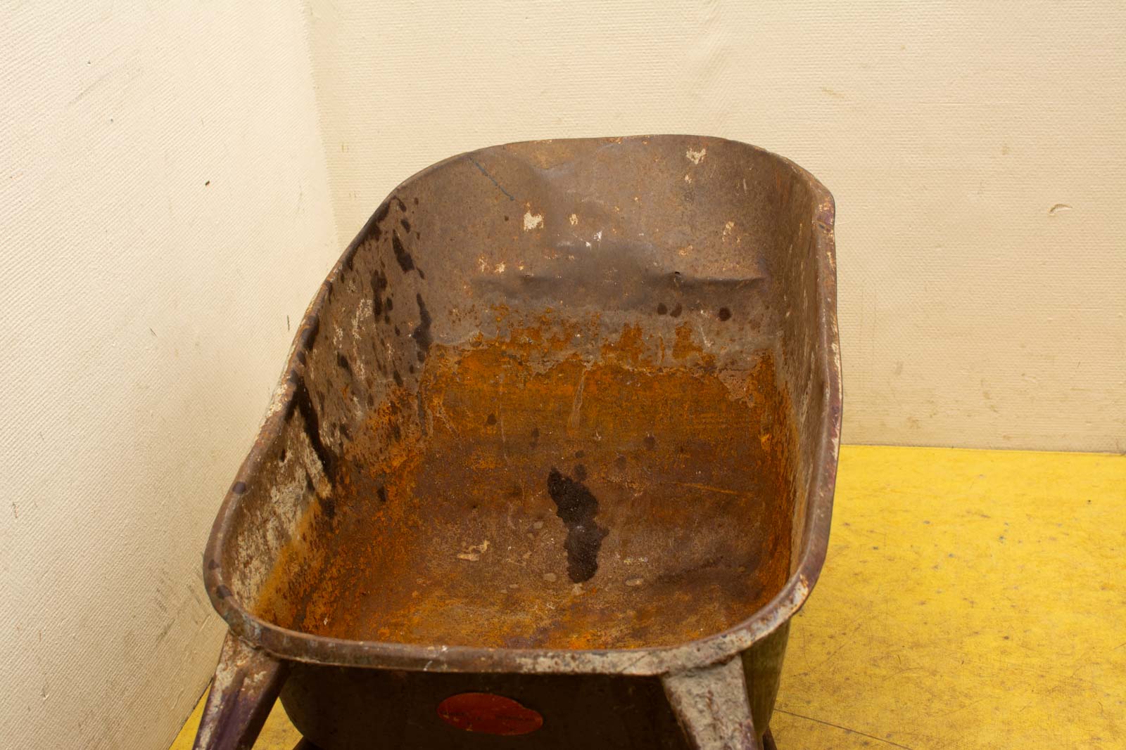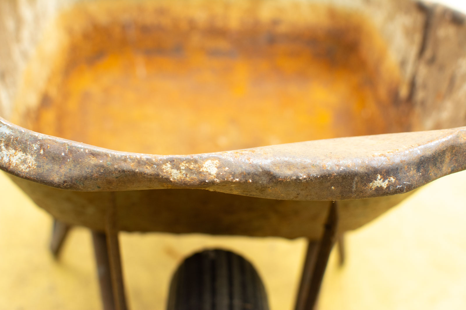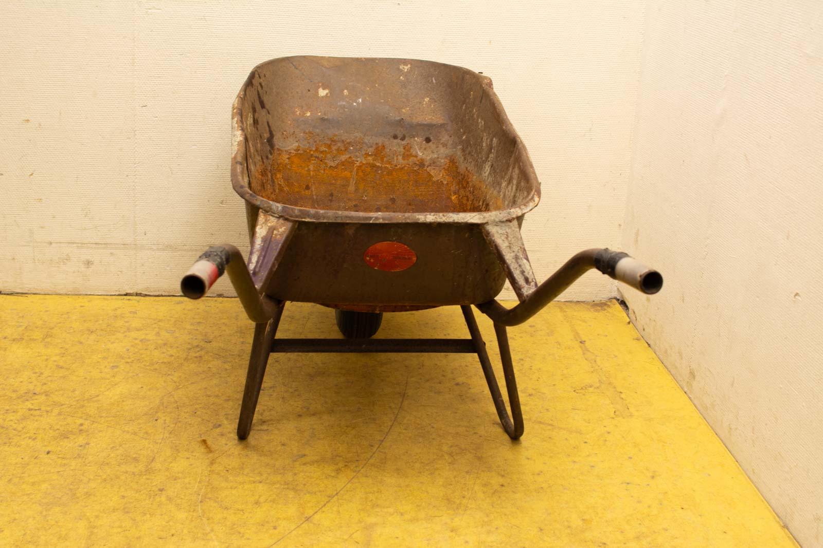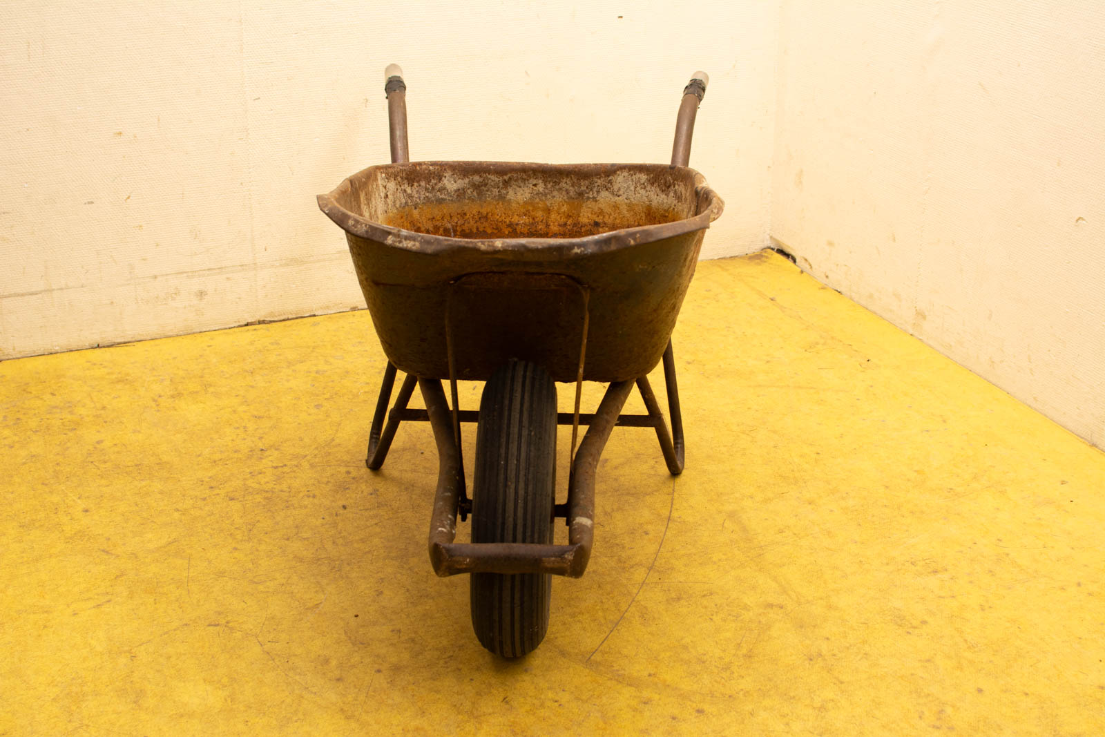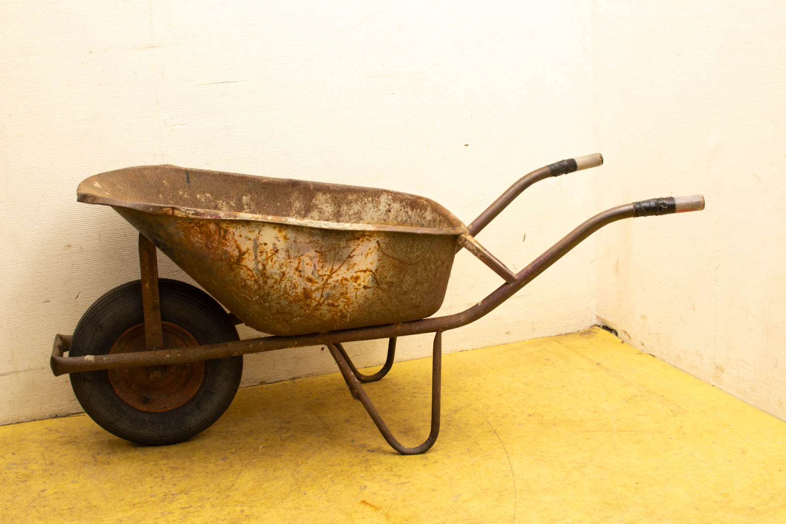 de kruiwagen is van ijzer en heeft roest en gebruikssporen