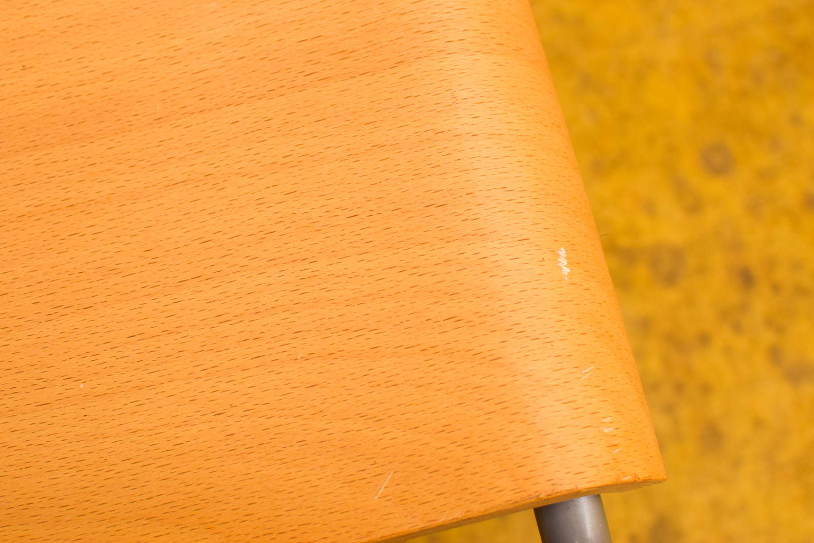 Het houten blad vertoont enkele vlekken die wijzen op vorig gebruik, maar verder is het krukje in redelijke staat. Het metalen frame is solide en ondersteunt het gewicht goed. Dit type meubel is veelzijdig inzetbaar: naast je bank als voetenbankje, als bijzettafel voor een kopje thee, of extra zitplaats in keuken of werkruimte.