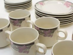 Een mooi servies bestaande uit, 6 ontbijtborden, 6 schoteltjes, 6 kopjes, melkkan en suikerpotje zonder deksel. In goede staat geen chips.