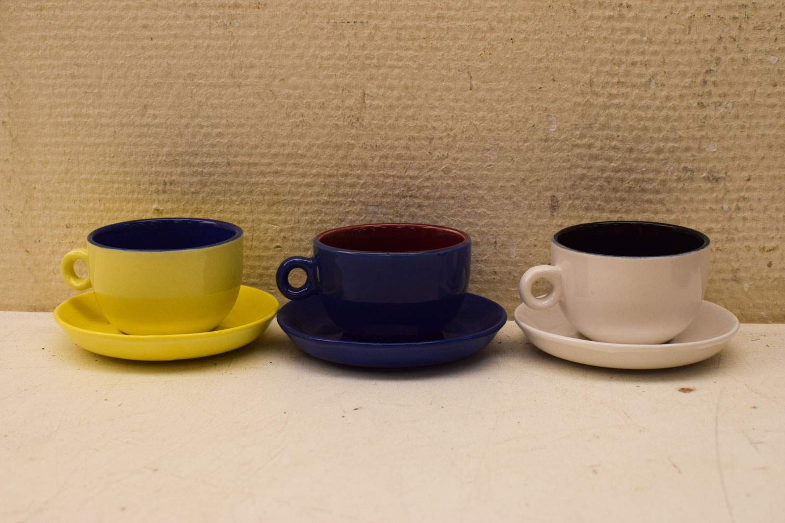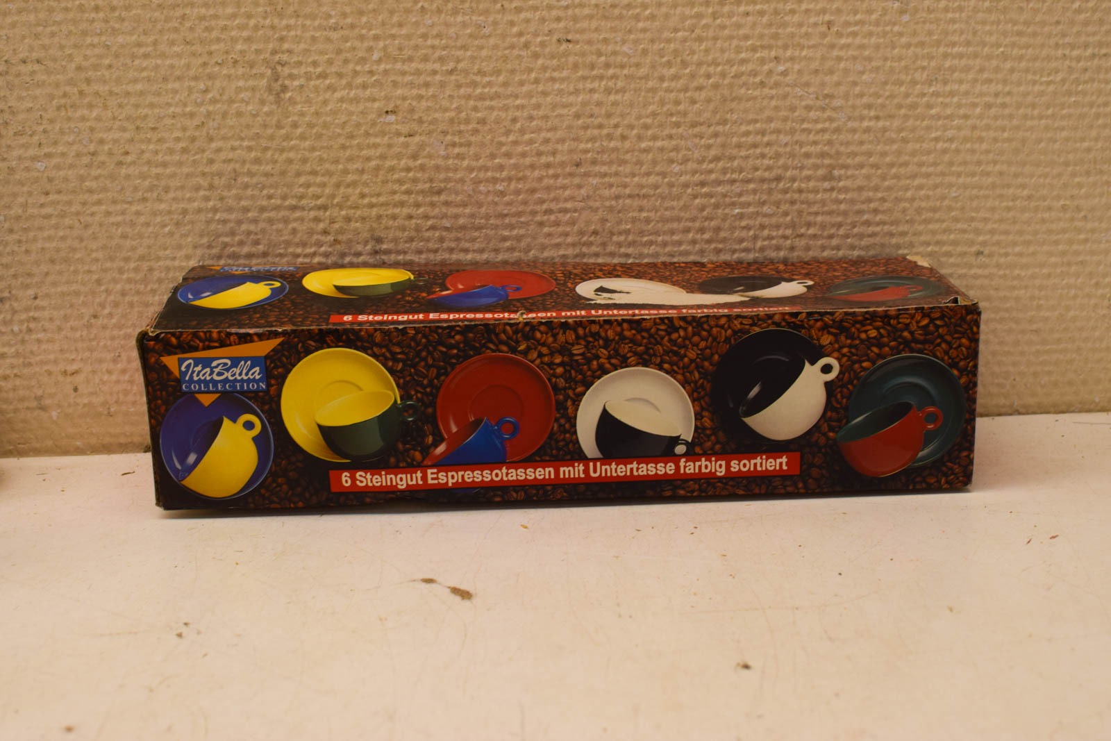 in verschillende kleuren diameter bovenkant van het kopje 7 cm hoog 4,5 cm diameter van het schaaltje 10 cm de doos heeft gebruikssporen