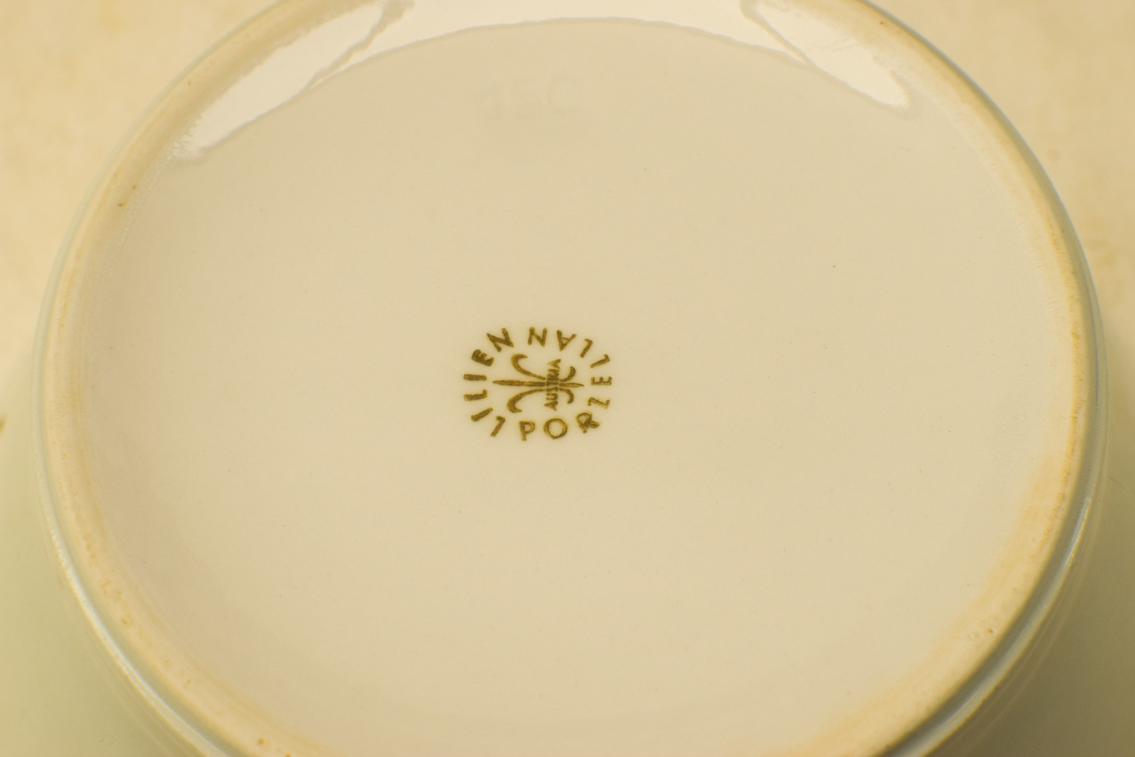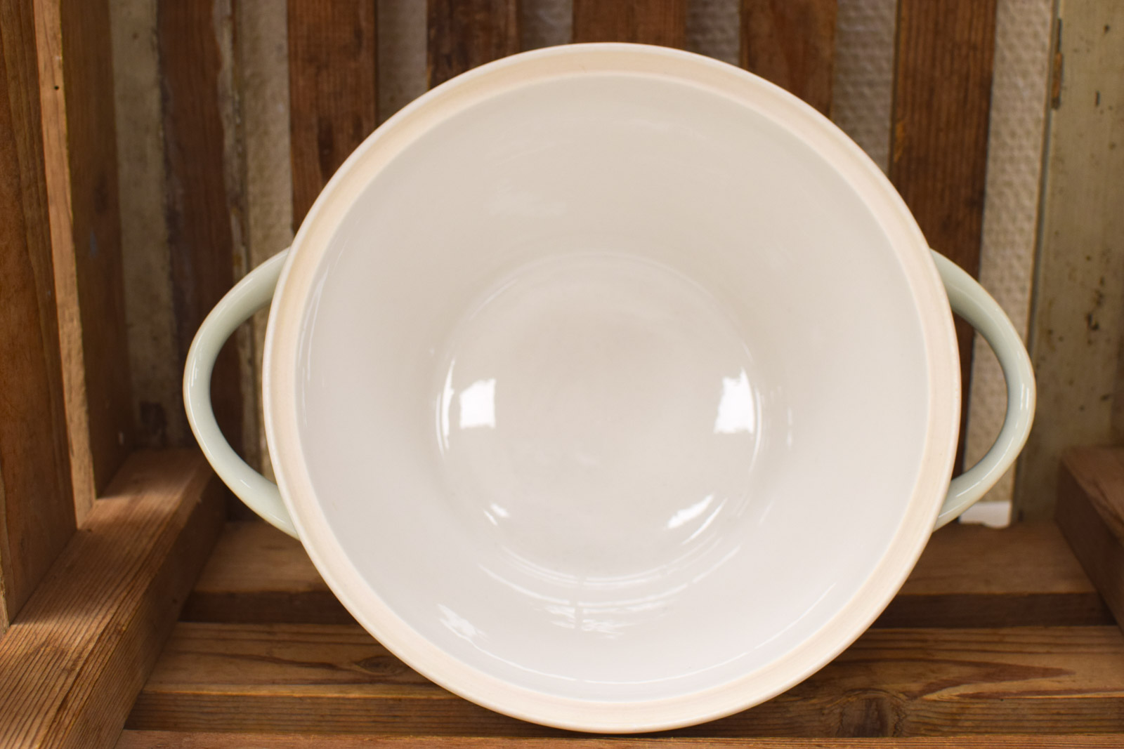 de buitenkant van de schaal is heel lichtgroen de deksel is wit van kleur gemeten zonder deksel gemeten diameter bovenkant opening 22 cm hoog 9,5 cm de afdekschaal is gebruikt heeft lichte krasjes aan de binnenkant maar ziet er verder redelijk uit