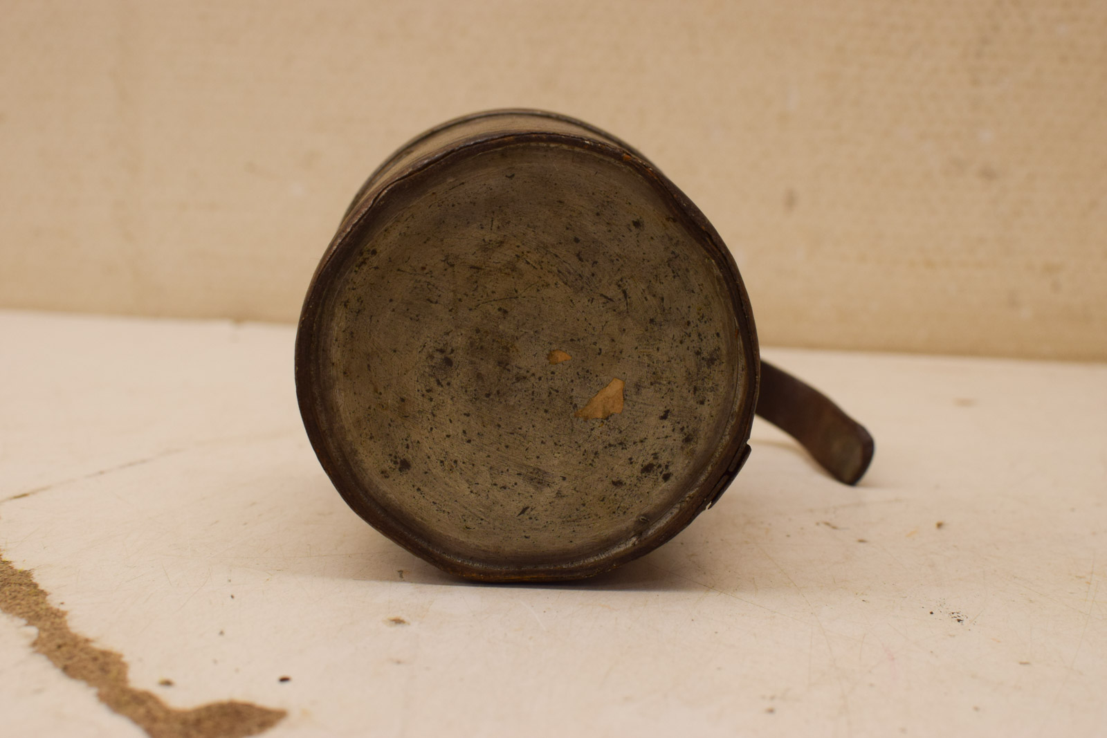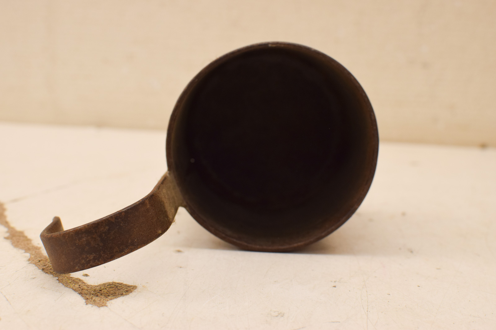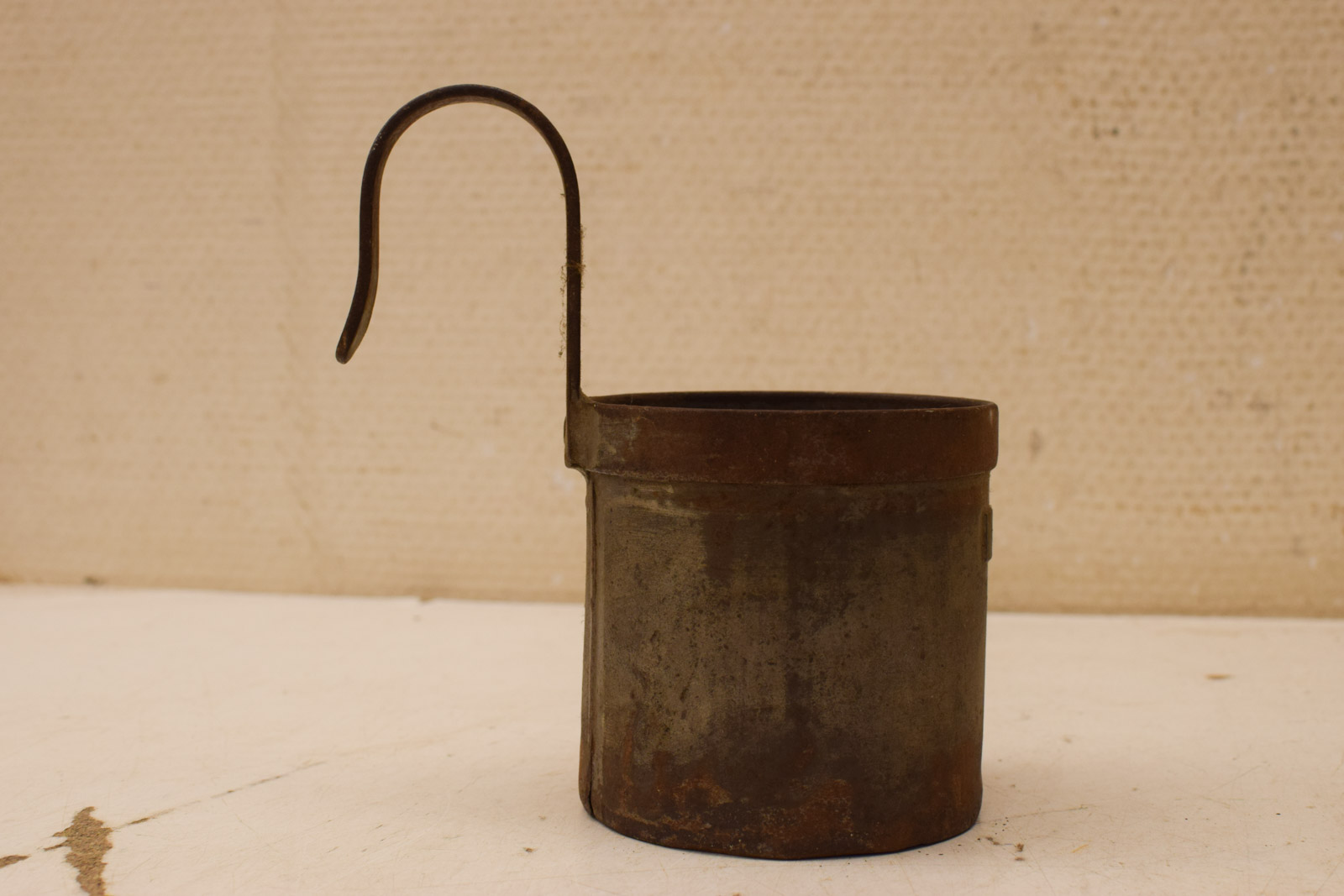 is gebruikt heeft roest en een klein gaatje op de bodem is van metaal diameter van de bovenkant opening 9 cm met haakje 16 cm