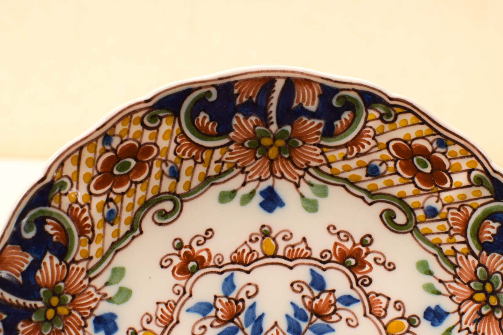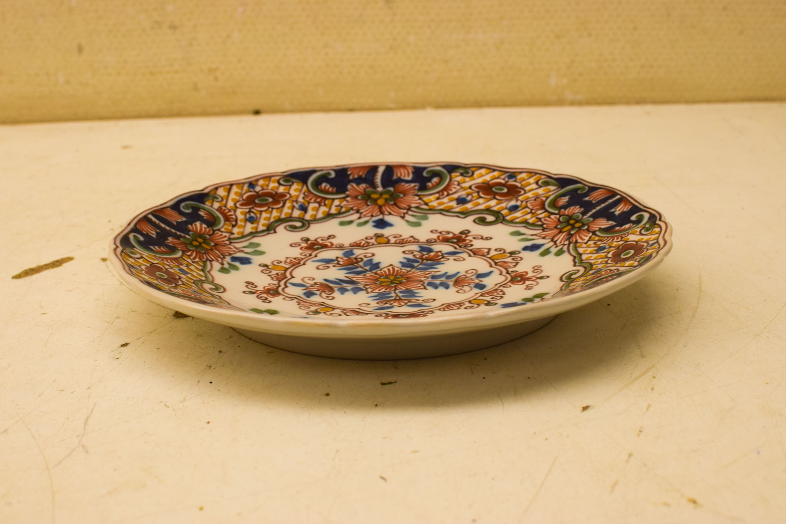 Het bord toont het kenmerkende Makkum-design: een symmetrisch bloemenpatroon in oranje, blauw, groen en geel op een crèmekleurige ondergrond. De rand is donkerblauw met decoratieve motieven, wat het geheel een klassiek en gezellig karakter geeft. Makkum is sinds 1594 bekend voor zijn ambachtelijk gereedmaakte aardewerk en porselein, en dit bord is een schoon voorbeeld van die Nederlandse erfenis.