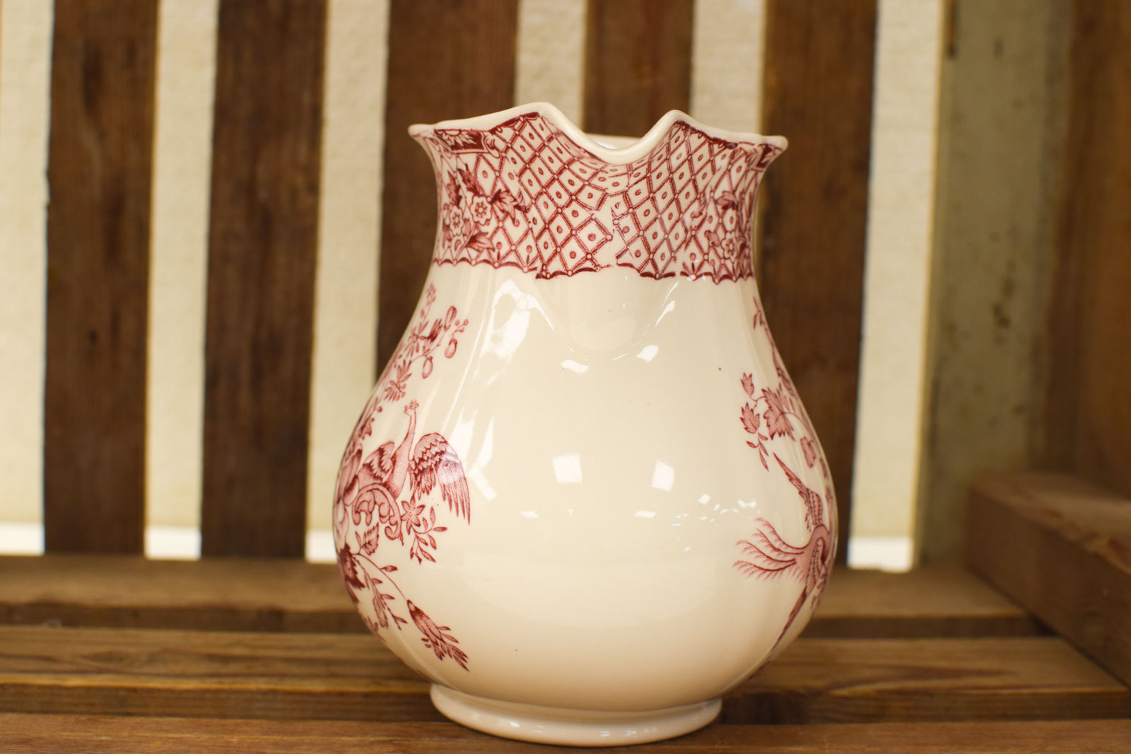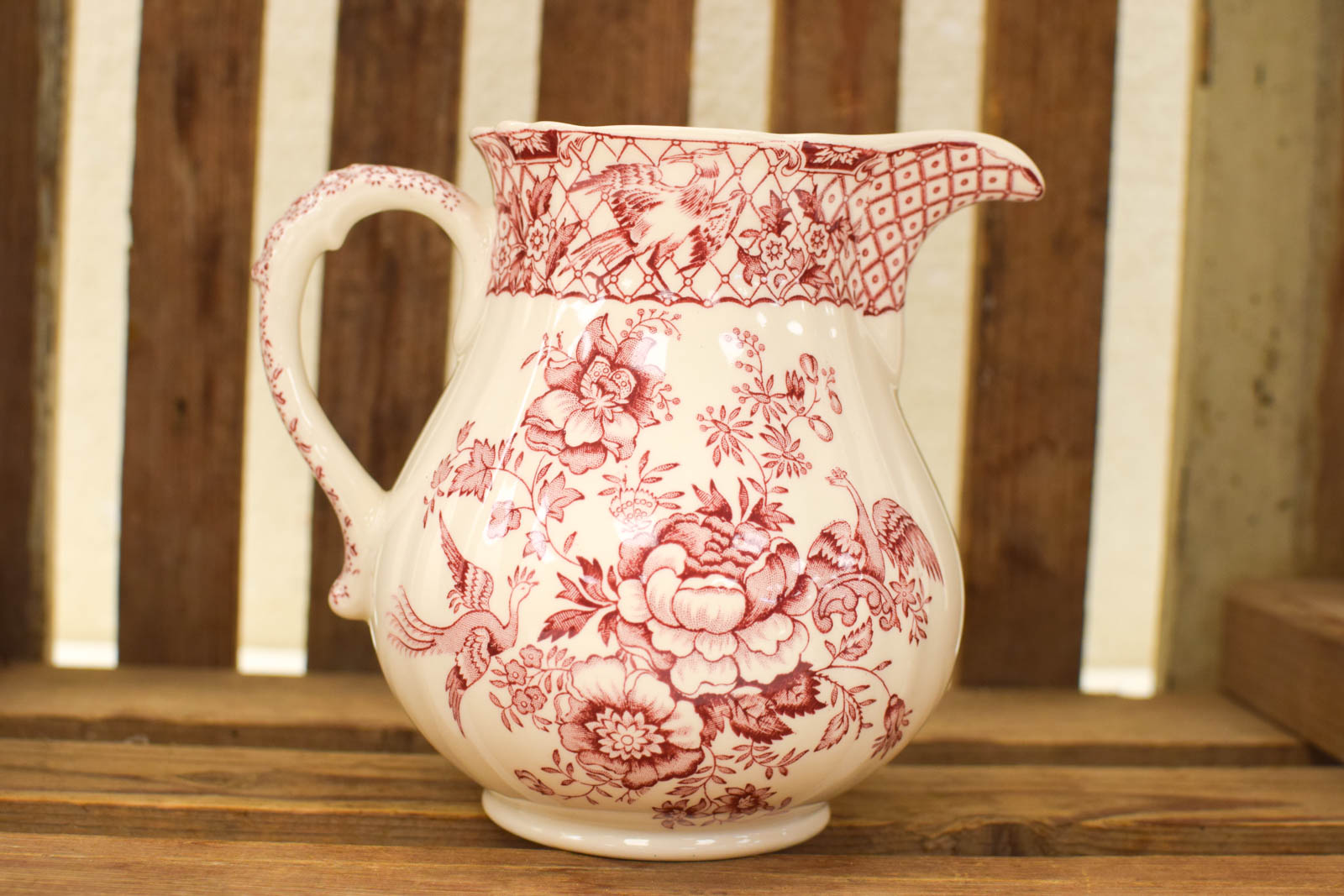 Deze Masons porseleinen kan is een mooi voorbeeld van klassiek Engels serviesgoed. Het ontwerp toont een gedetailleerde roze bloemenprint met vogels en botanische motieven, uitgevoerd in het kenmerkende transferware-stijl waar Masons om bekend staat. De rand heeft een decoratief patroon met ruitjes en lijntekeningen.