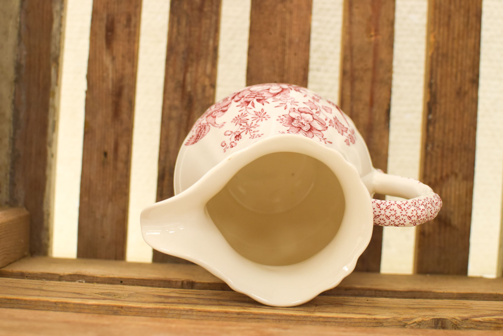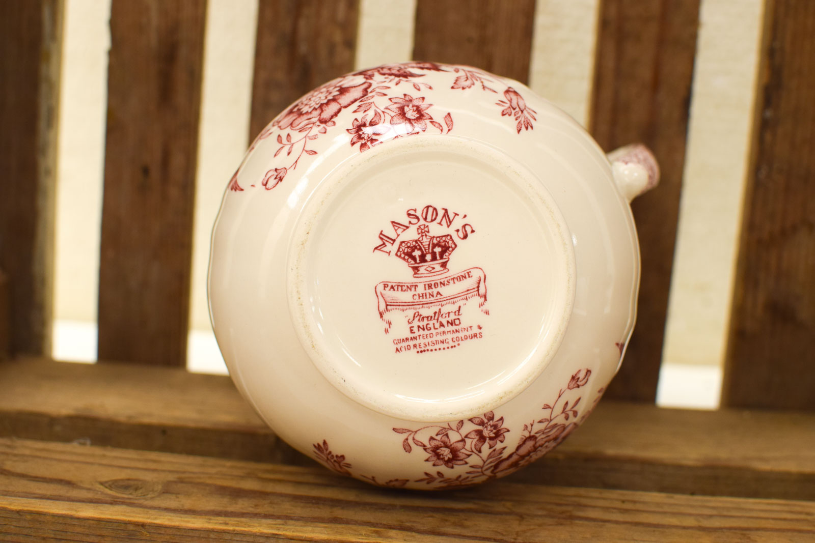De kan is gemaakt van Patent Ironstone China, een sterke porseleinsoort die Masons in de 19de eeuw patenteerde en die berucht was om zijn duurzaamheid. Deze kan stamt uit die periode en draagt het originele merkje op de bodem met de kroon en garantie van Masons, Fenton, England.