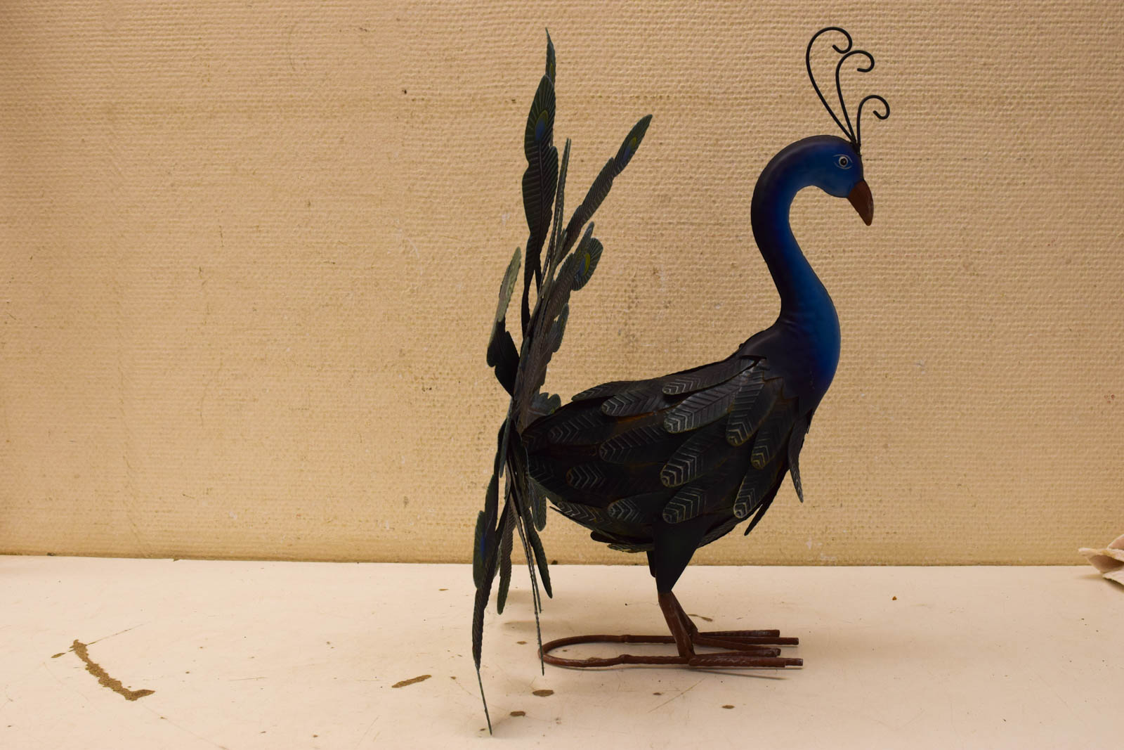 Dit metalen pauw tuinbeeld is een opvallende decoratie voor je tuin of terras. Het beeld toont een pauw met voluit gespreide veren, waarin meer dan dertig veren zijn uitgewerkt met groen en geel accent op elk veertje. Het lichaam is uitgevoerd in een donkerblauwe kleur, met een bruine snavel en een karakteristieke blauwe halslijn. Een elegant gekruld staartje completeert het ontwerp.