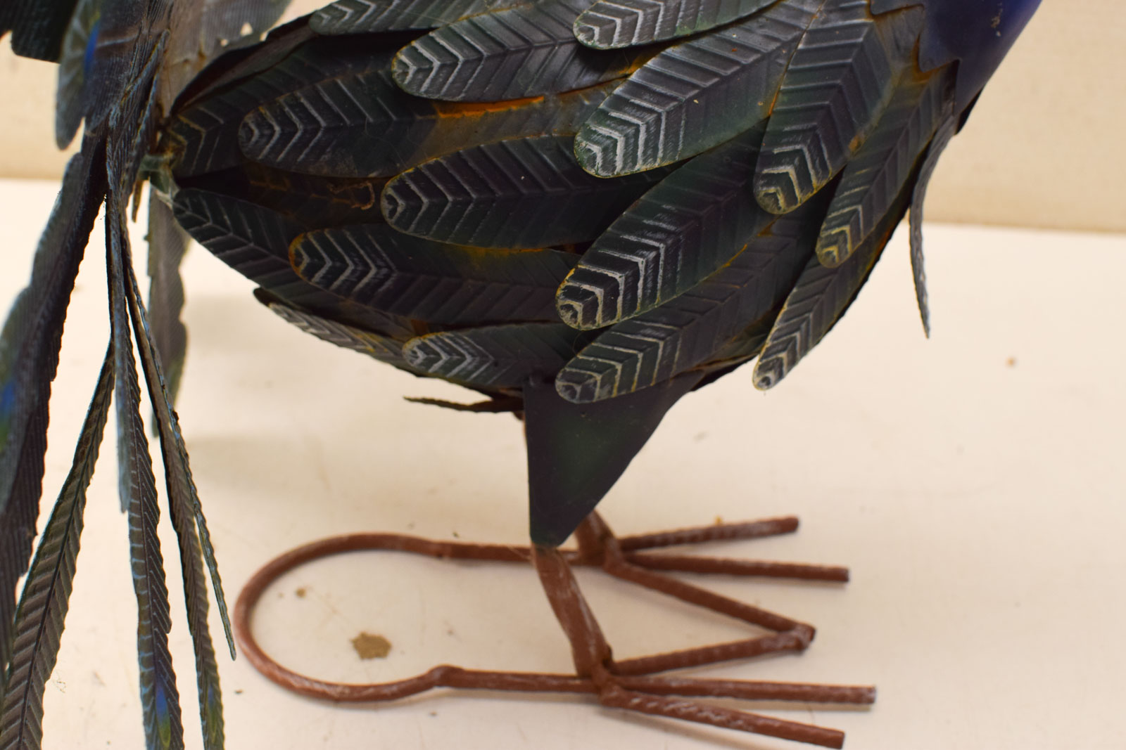 Het metaal vertoont zichtbare roest en gebruikssporen, wat vooral zichtbaar is op verschillende onderdelen. Dit geeft het beeld een authentieke, betaalde uitstraling die past bij tuin- en terrastuindecoratie met karakter. Het pauwmotief heeft cultureel belang in vele tradities en staat symbool voor schoonheid en fierheid, wat dit beeld een betekenisvolle keuze maakt voor liefhebbers van klassieke tuindecoratie.