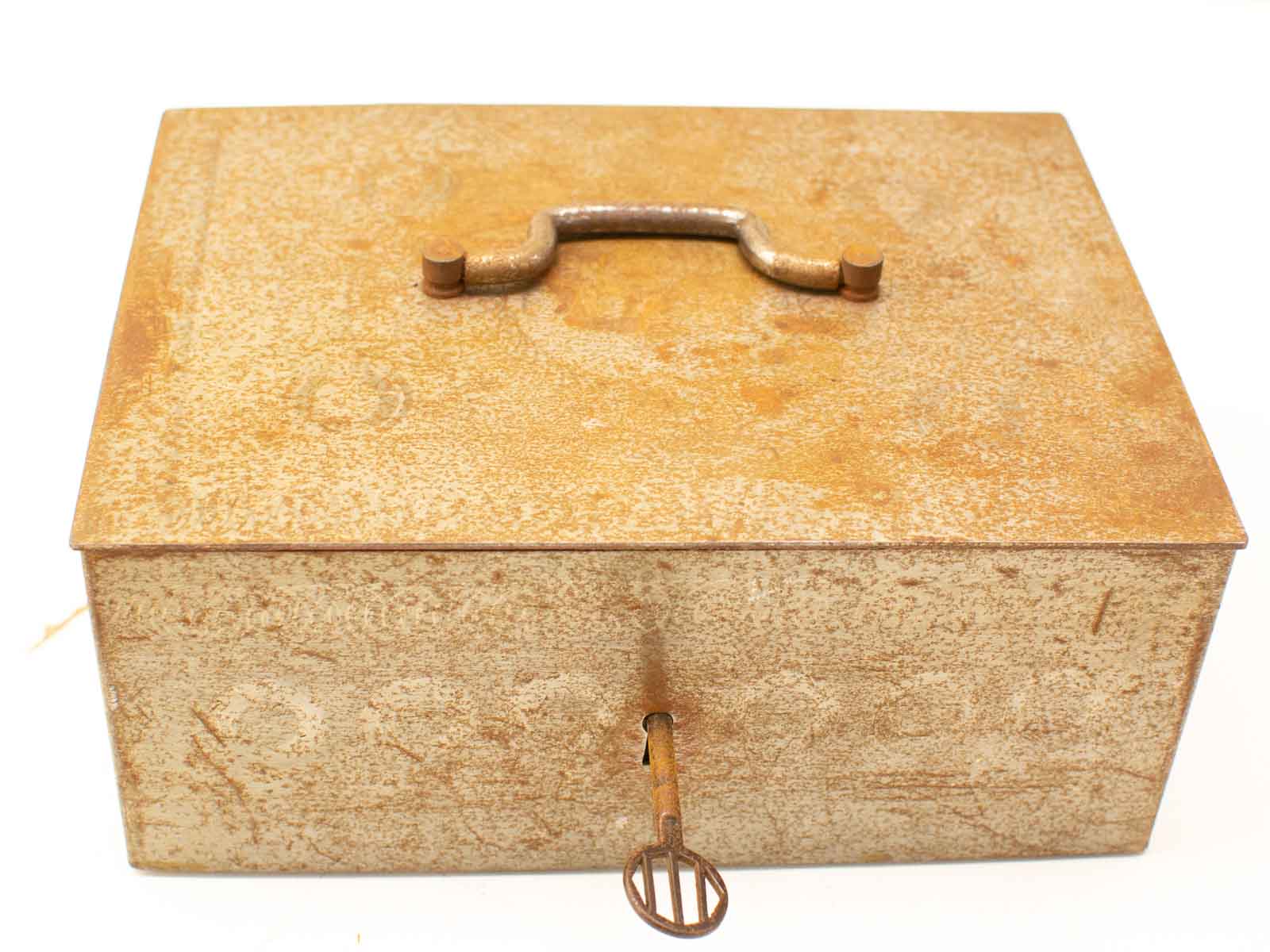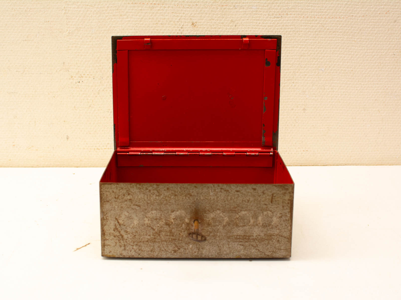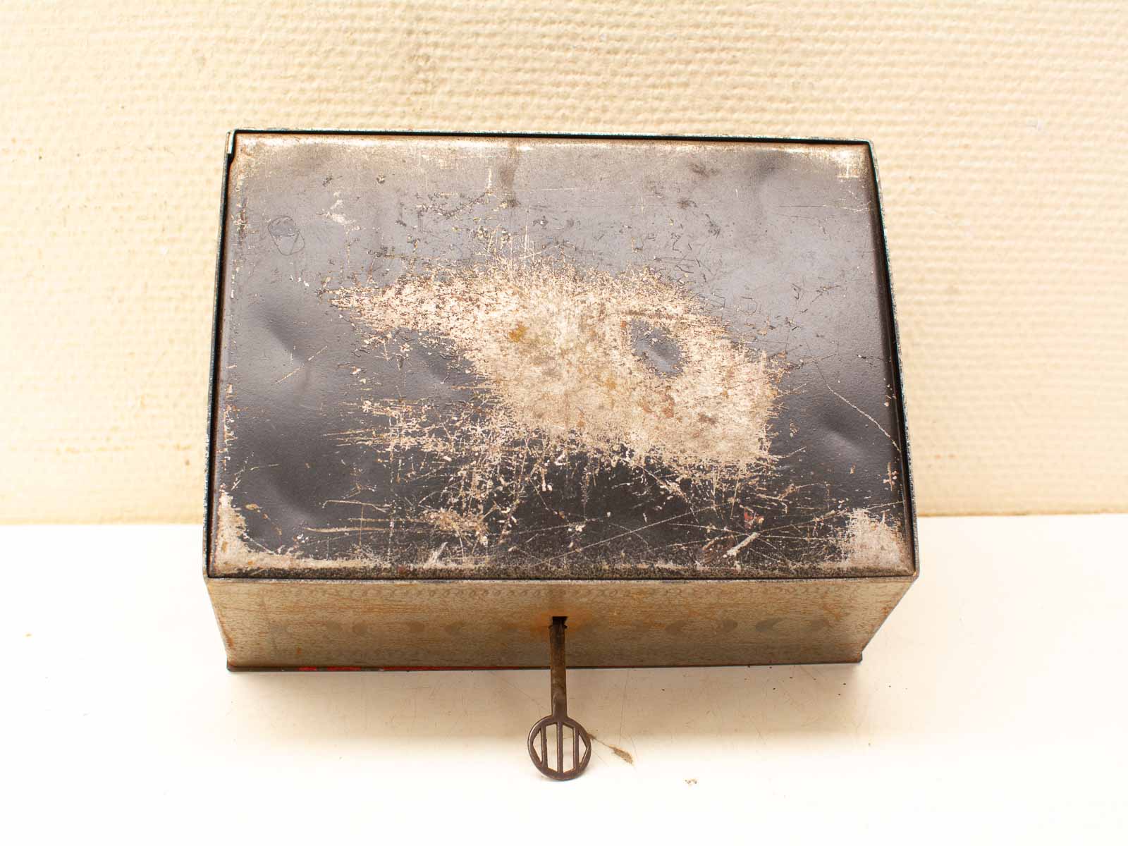 de deksel gaat moeilijk open en dicht het geldkistje heeft roest aan de buitenkant