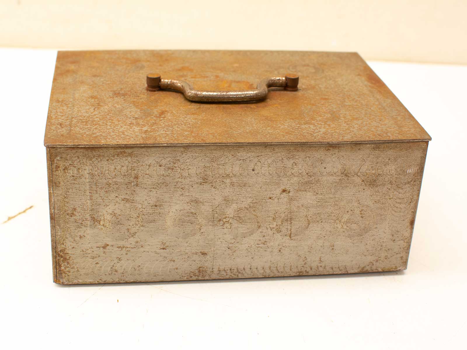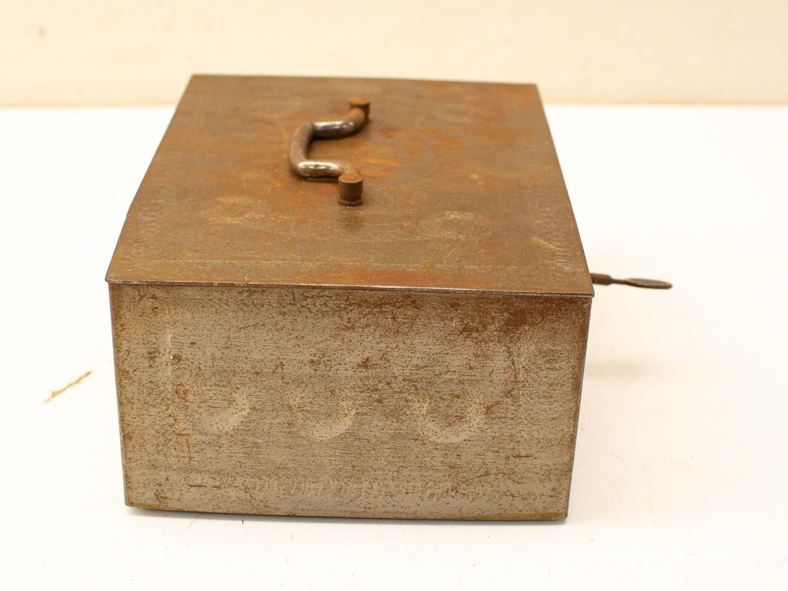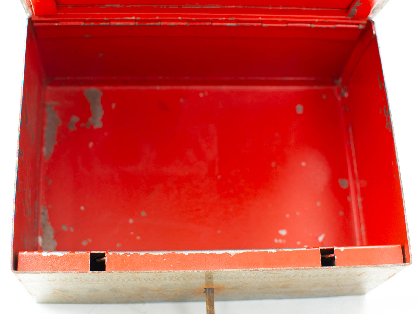 de deksel gaat moeilijk open en dicht het geldkistje heeft roest aan de buitenkant