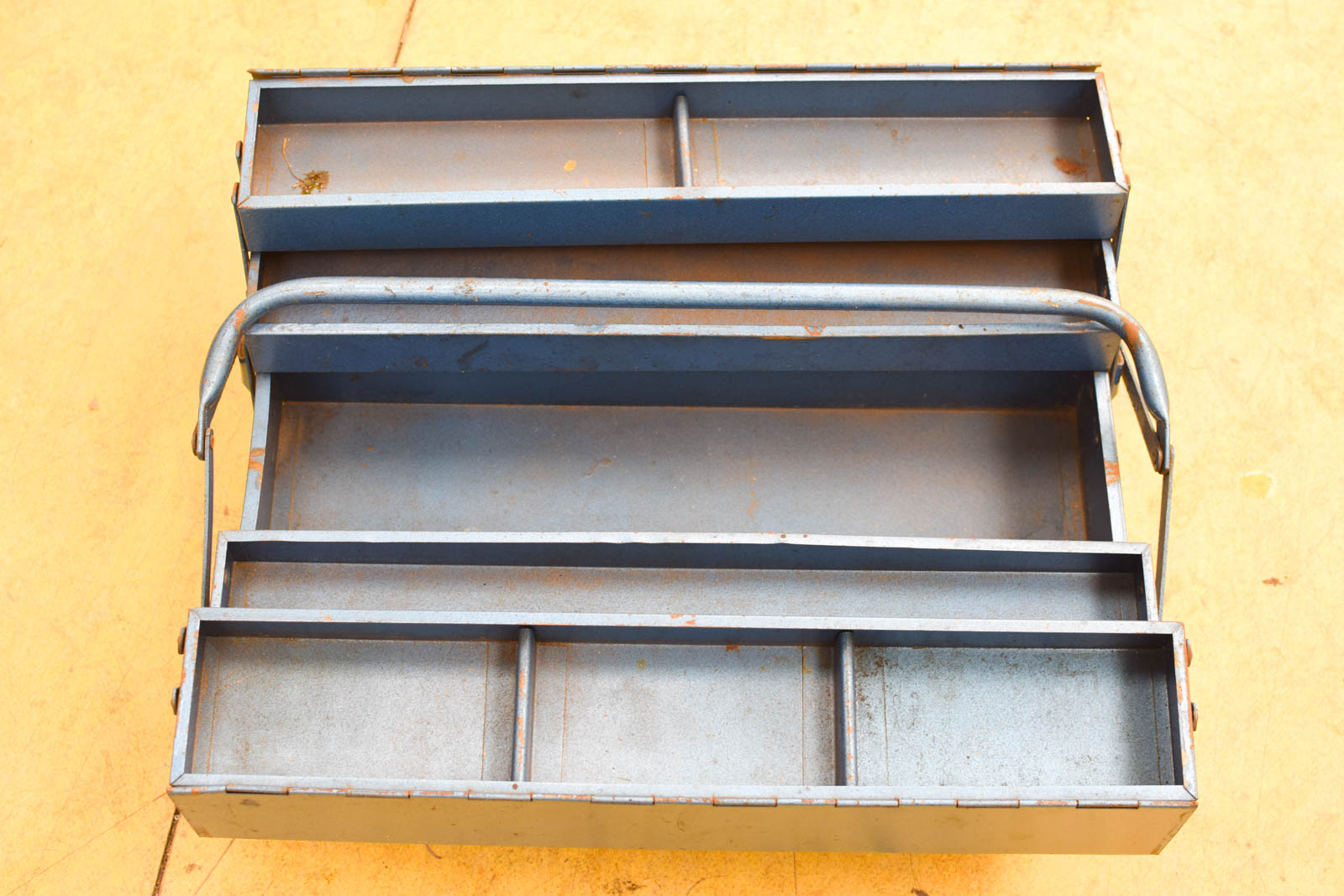 Deze metalen gereedschapskist is een praktisch vintage stukje uit de werkplaats. Met een breedte van 53 centimeter, diepte van 20,5 centimeter en hoogte van 20 centimeter, biedt hij goed opbergruimte voor gereedschap en kleine onderdelen. De kist is voorzien van uitklapbare zijvakken met blauwe metalen beugels, zodat je je gereedschap overzichtelijk en bereikbaar hebt liggen.