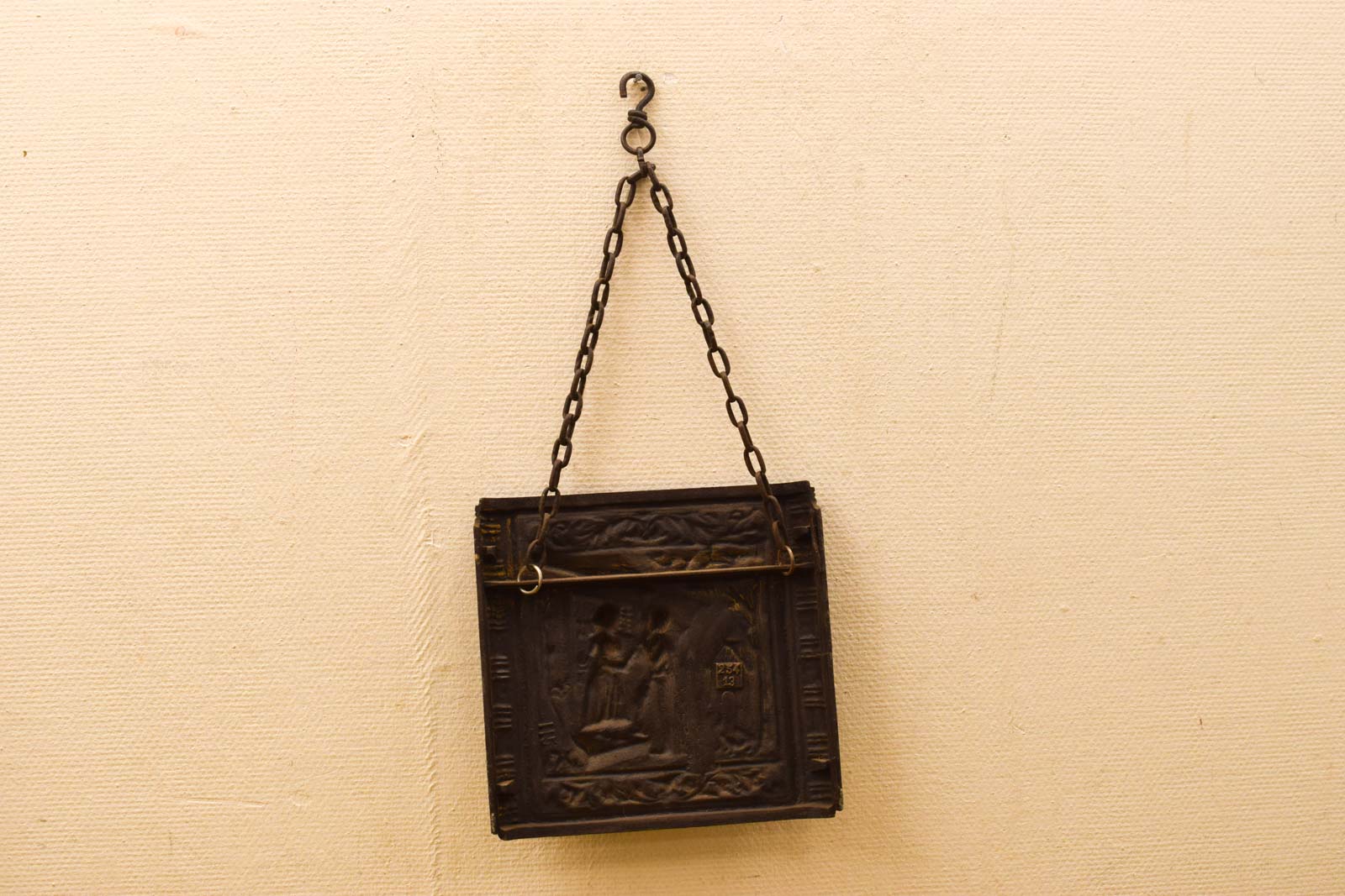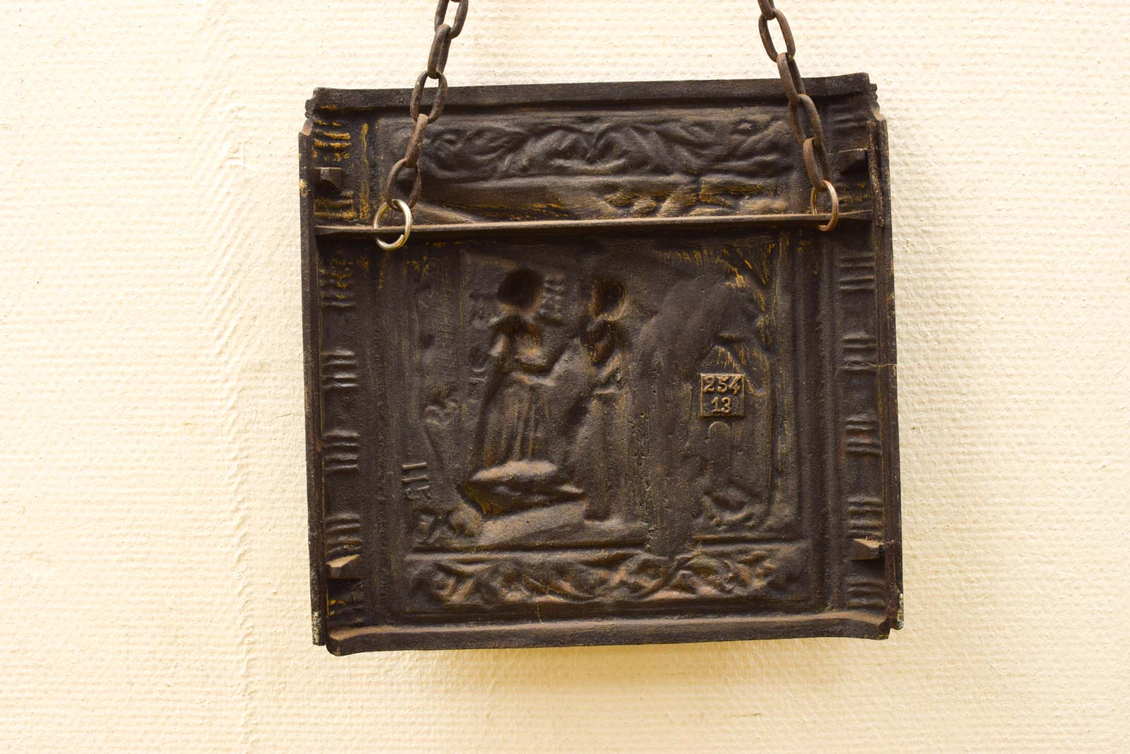 Het wandschilderij hangt aan een stevige ijzeren ketting en is direct klaar om op te hangen. De plaat ziet er redelijk uit maar vertoont gebruikssporen die passen bij de ouderdom van dit stuk. De afwerking is donkerbruin tot zwart met hier en daar goudkleurige accenten zichtbaar op de verhoogde delen.