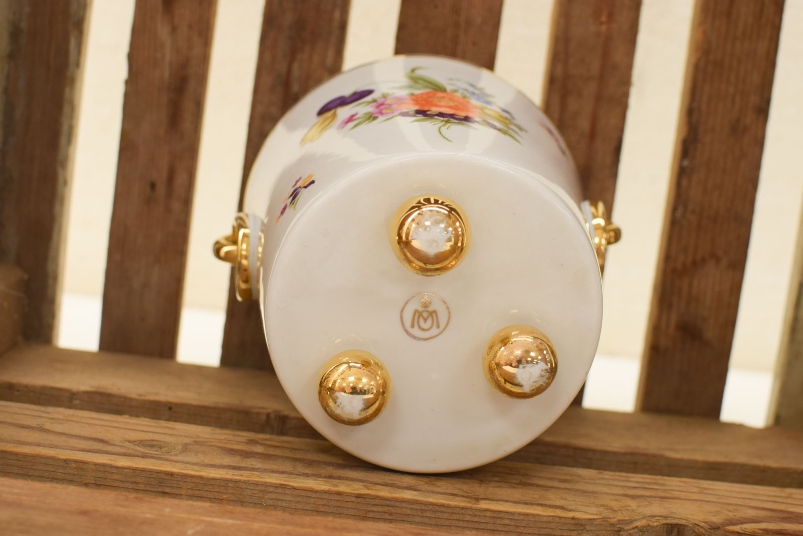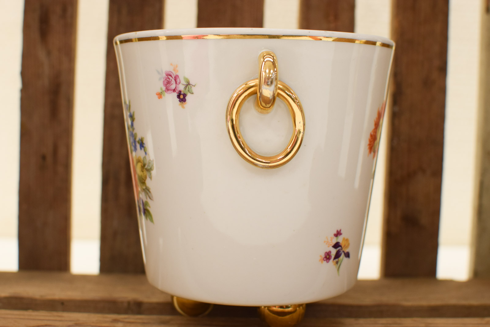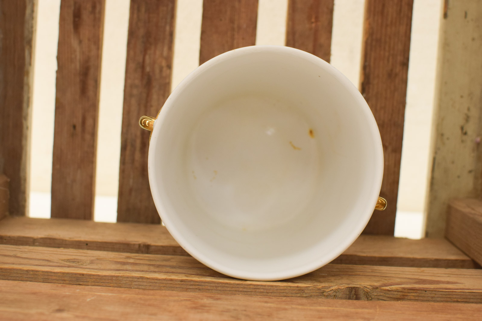 heeft slijtage op het verfvlekjes aan de binnenkant diameter bovenkant opening 13 cm hoog 13.5 cm heeft 3 bolletjes aan de onderkant zie foto