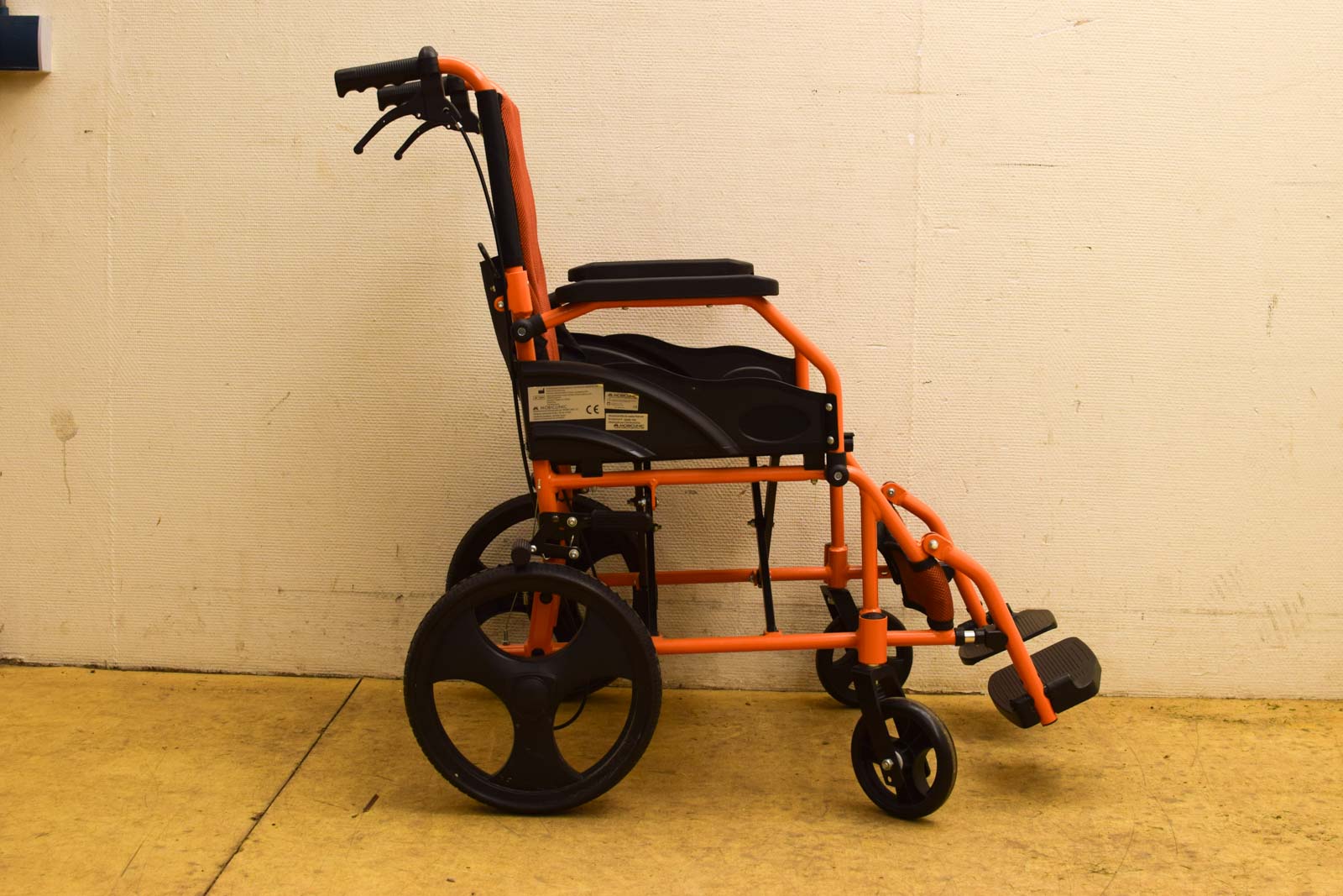 Mobi Clinic inklapbare rolstoel in nette staat met remmen op de handvaten. Compact en voorzien van leuningen. Breedte 55 cm, zithoogte 45 cm.