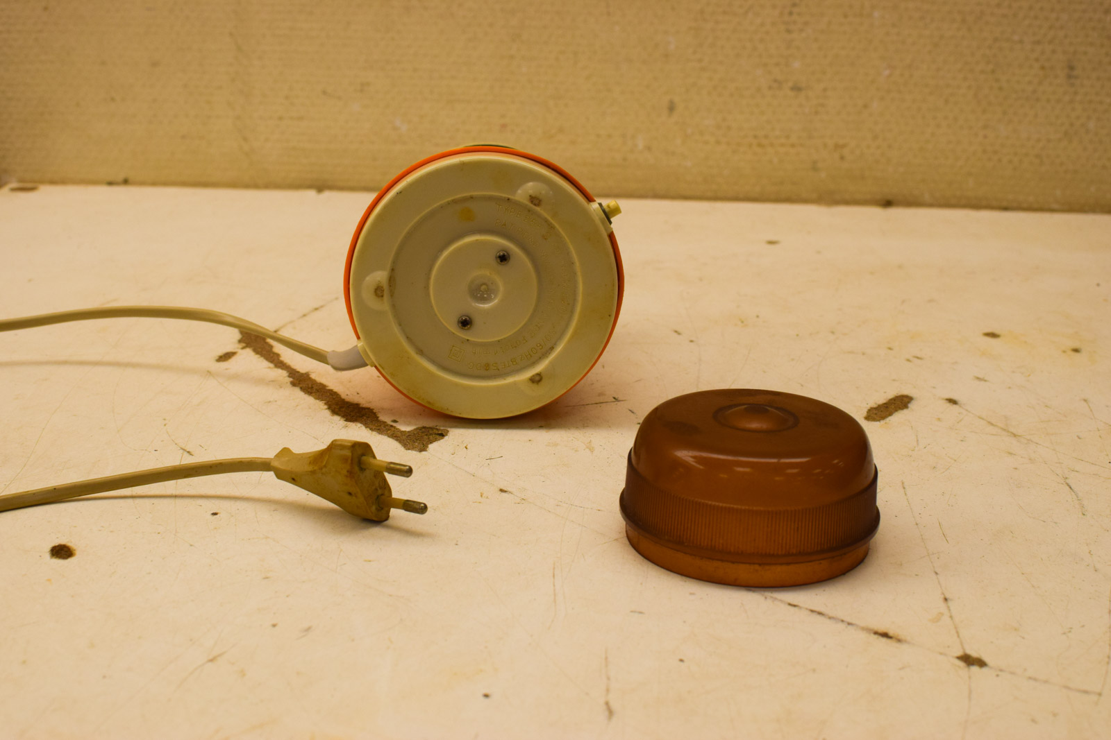 De koffiemolen werkt met een elektrische motor en is voorzien van een zwart draaiend mesje voor het malen van koffiebonen. Het kunststof onderstel en de eenvoudige constructie zijn volledig intact. De voedingskabel en stekker zijn aanwezig. Het apparaat is gebruikt en toont dan ook normale slijtage en patina op de behuizing; het oppervlak heeft lichte krassen en vlekken die typerend zijn voor vintage keukengerei van deze leeftijd.