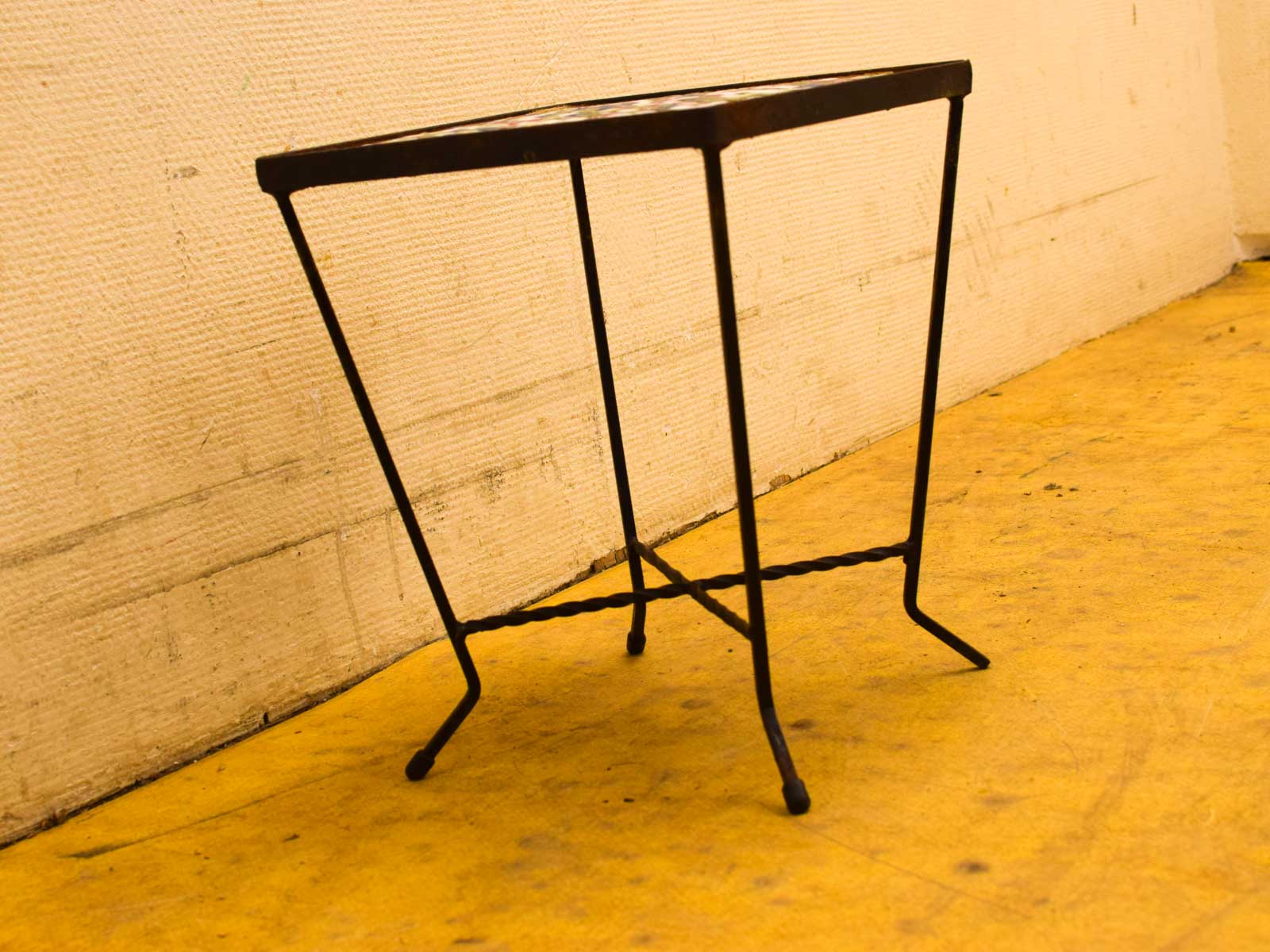 Het onderstel is praktisch en sober uitgevoerd, wat goed contrasteert met het speelse mozaïek bovenop. Mozaïektafels zoals deze zijn sinds het midden van de twintigste eeuw geliefd in brocante en retro design, vooral vanwege hun kleurrijke uitstraling en handgemaakte charme.