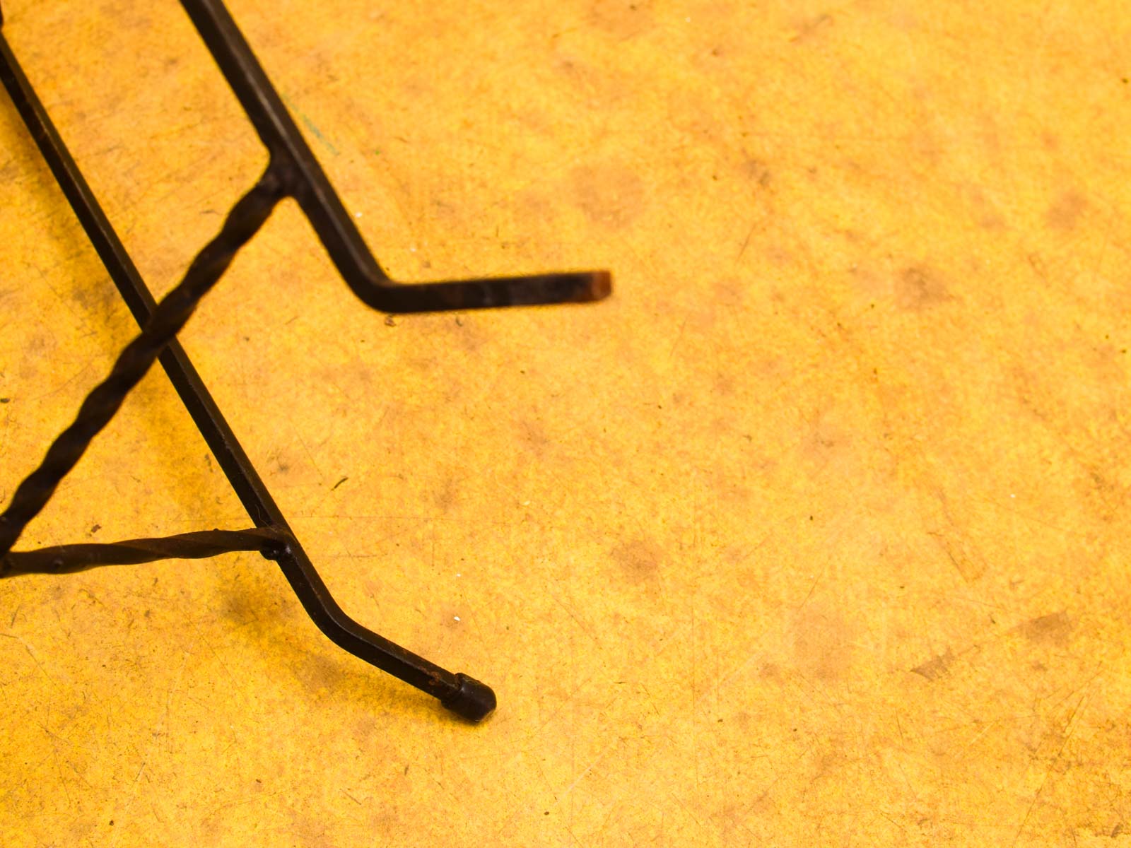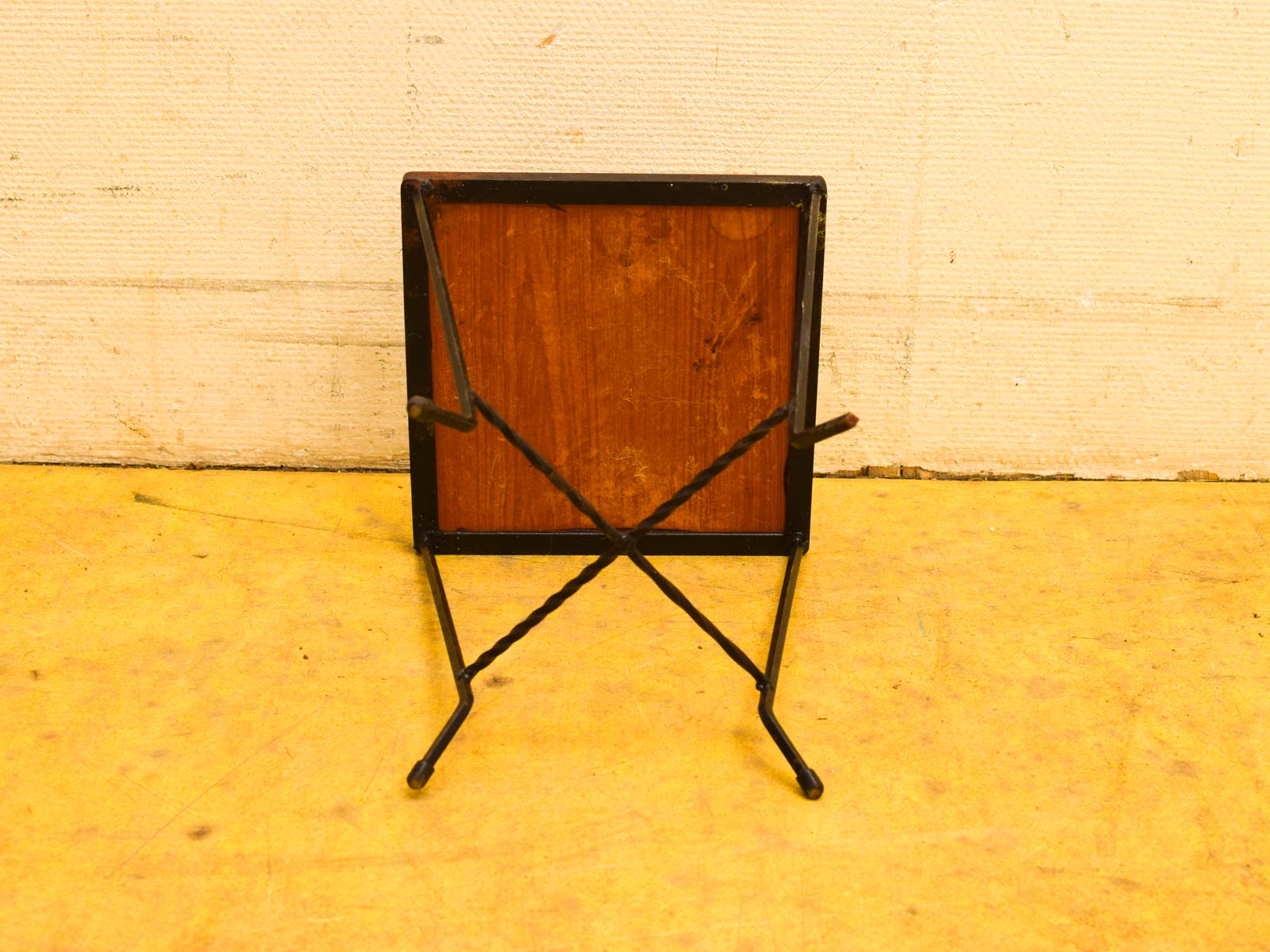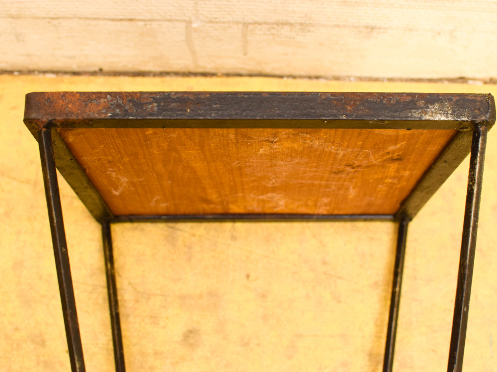 Over de staat: Het tafelblad heeft gebruikssporen. Het metalen onderstel vertoont roest bij één pootje en mist het hoesje daarvan (zie foto’s). Ondanks deze gebreken is het tafelkje functioneel en heeft het een authentieke vintage uitstraling.