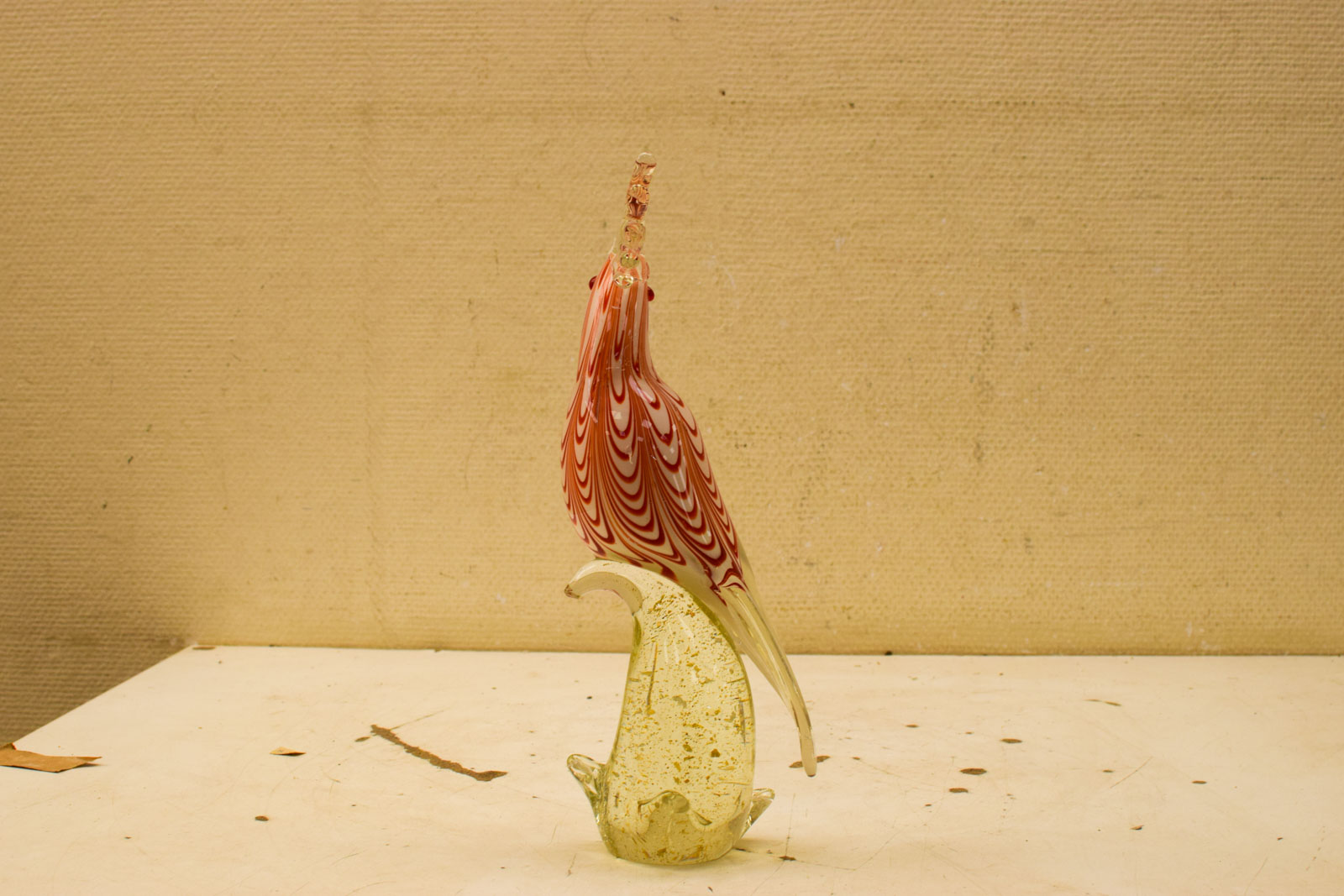 Dit Murano glazen kaketoe vogel beeldje is een mooi voorbeeld van Italiaanse glassculptuur. Het kunstwerk is handgemaakt uit glas met een rode vogel die contrast afsteekt tegen een gele, gespikkelde basis. De typische Murano-techniek geeft dit stuk zijn karakteristieke glans en kleurintensiteit.