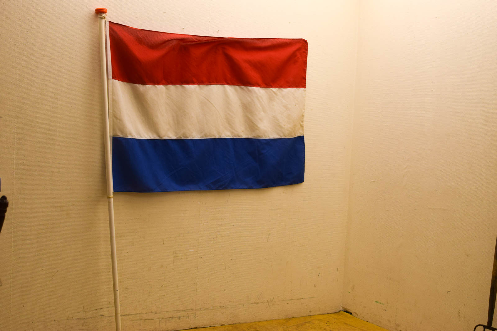 De vlag en stok zijn gebruikt en vertonen normale gebruikssporen. De stok is van hout en toont tekenen van gebruik. Dit zijn dingen die je kan verwachten van een vlag die buiten heeft gehangen, bijvoorbeeld door weersinvloeden of langdurig gebruik.