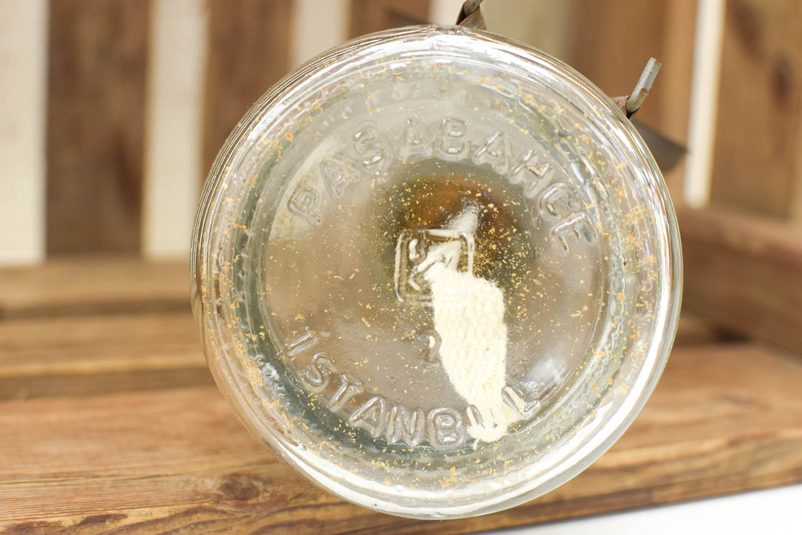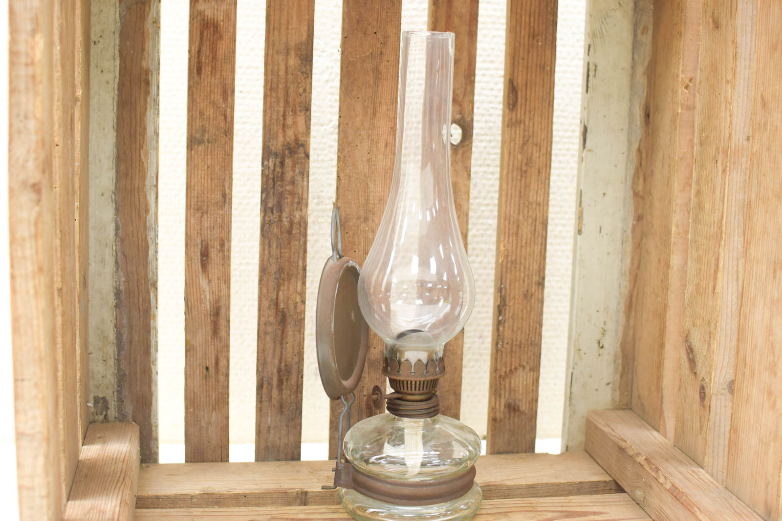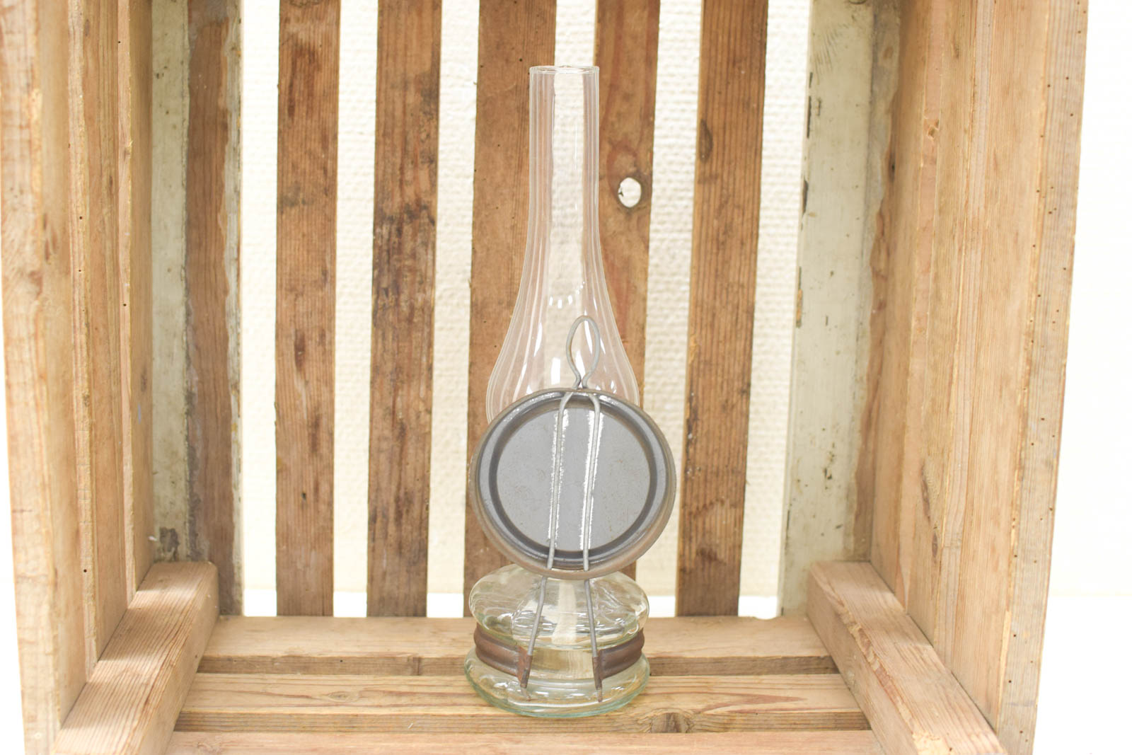 de lamp heeft nog een lont het glas is nog heel diameter bovenkant opening 3 cm hoog 30,5 cm