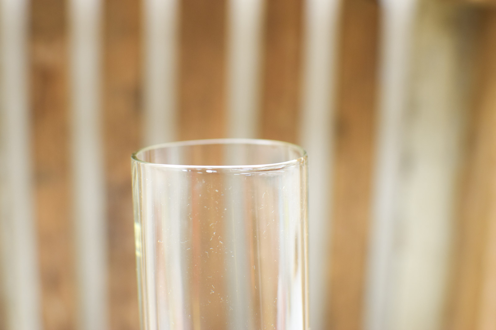 de bovenkant van het glas heeft een beschadigingetje verder is het glas nog goed diameter bovenkant opening 5 cm diameter onderkant opening 6,5 cm hoog 28 cm
