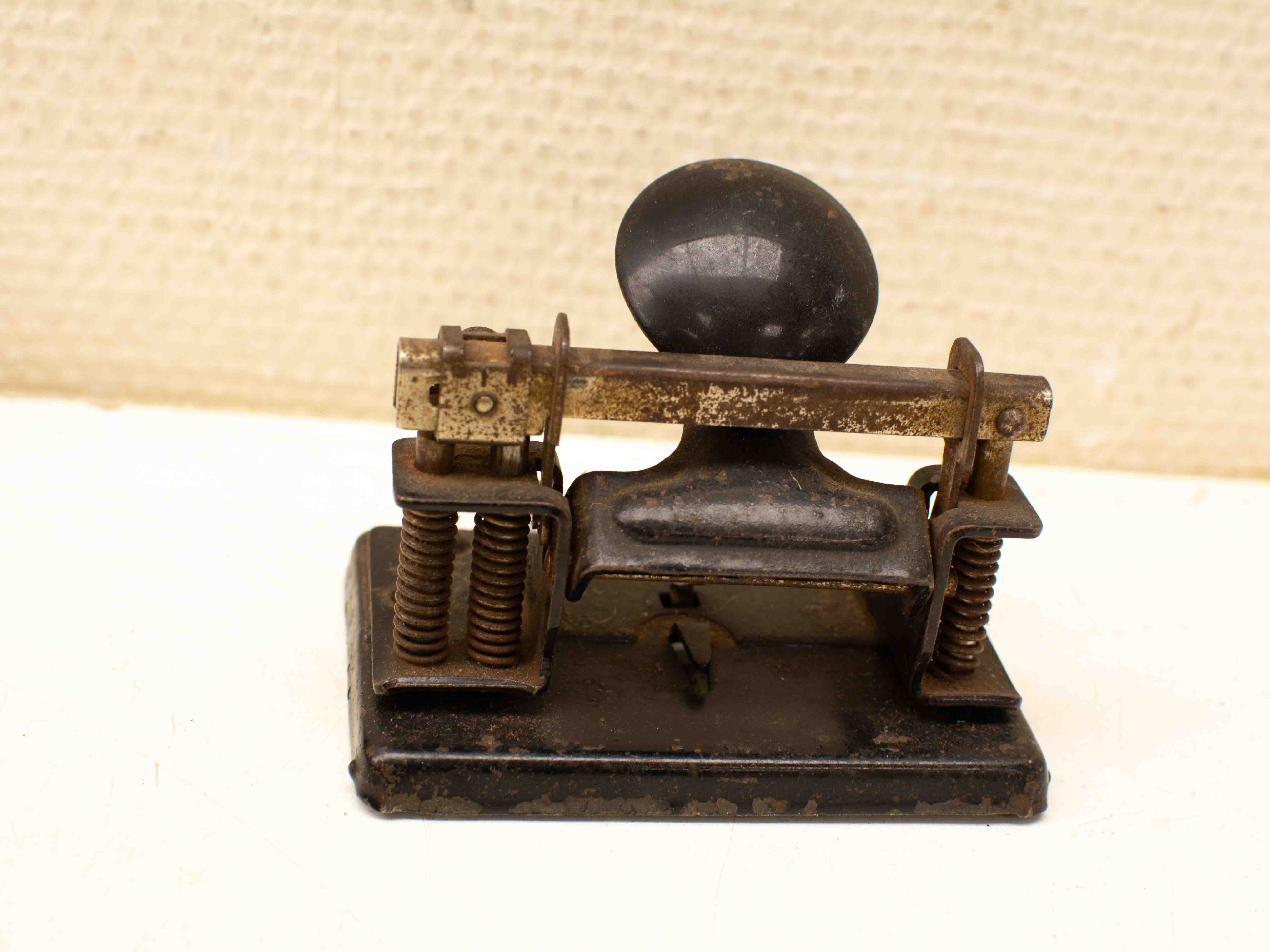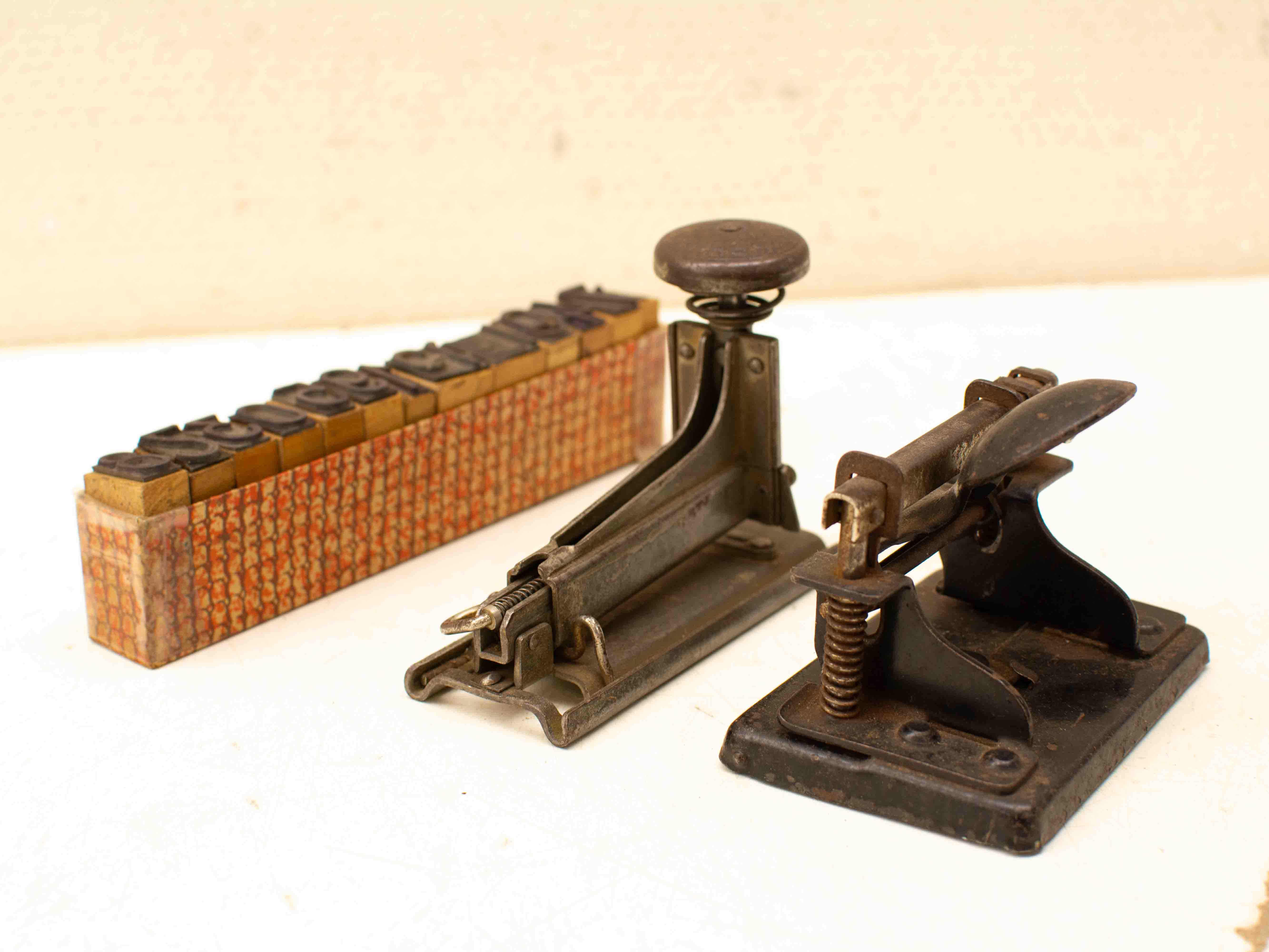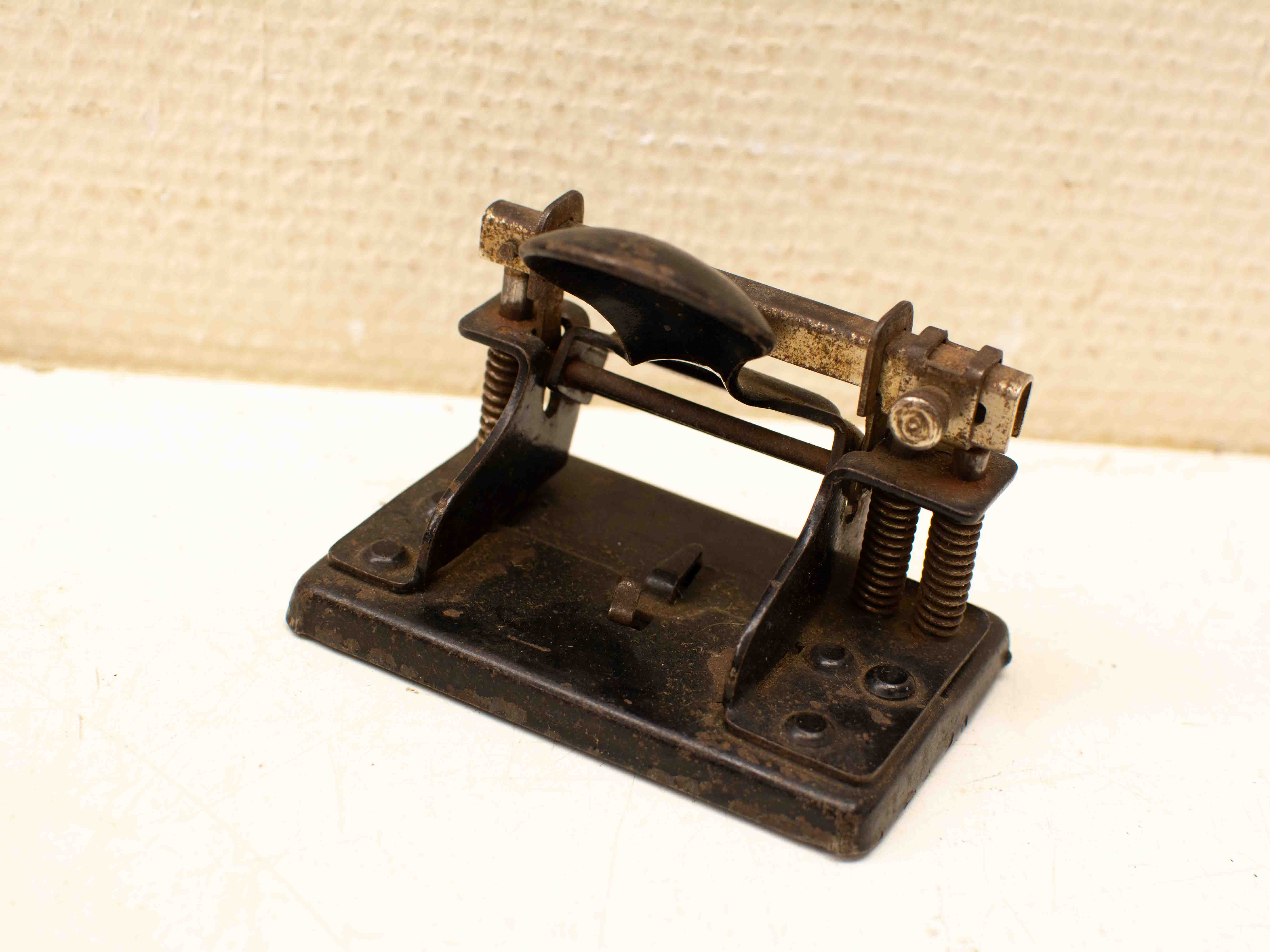 een Oude Nietmachine,stempels en een perforator de perforator is breed 10 diepte 7 cm hoog 7,5 cm