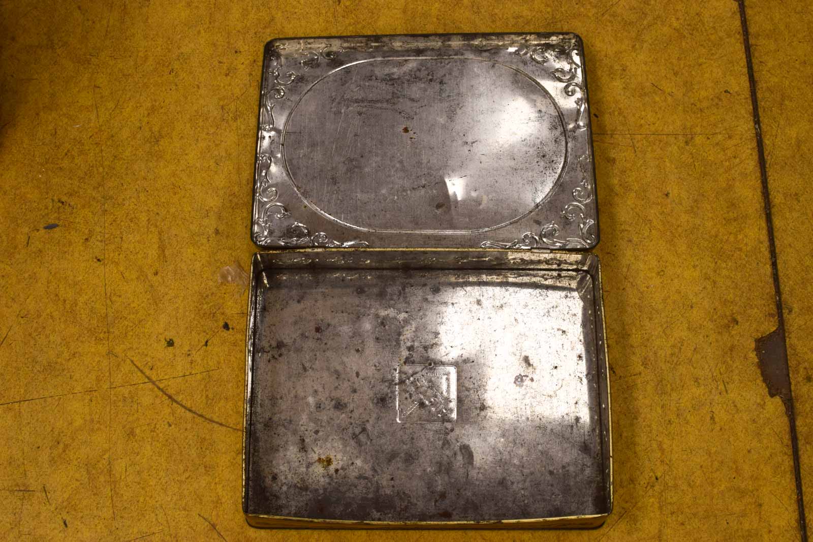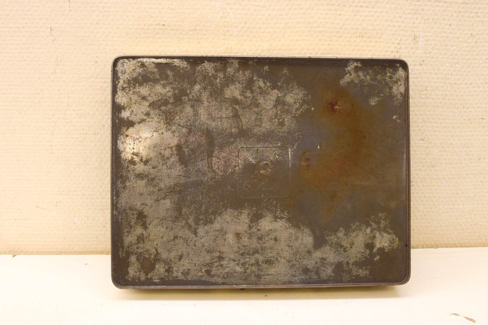 de deksel sluit stroef de blik is gebruikt en heeft gebruikssporen en roest