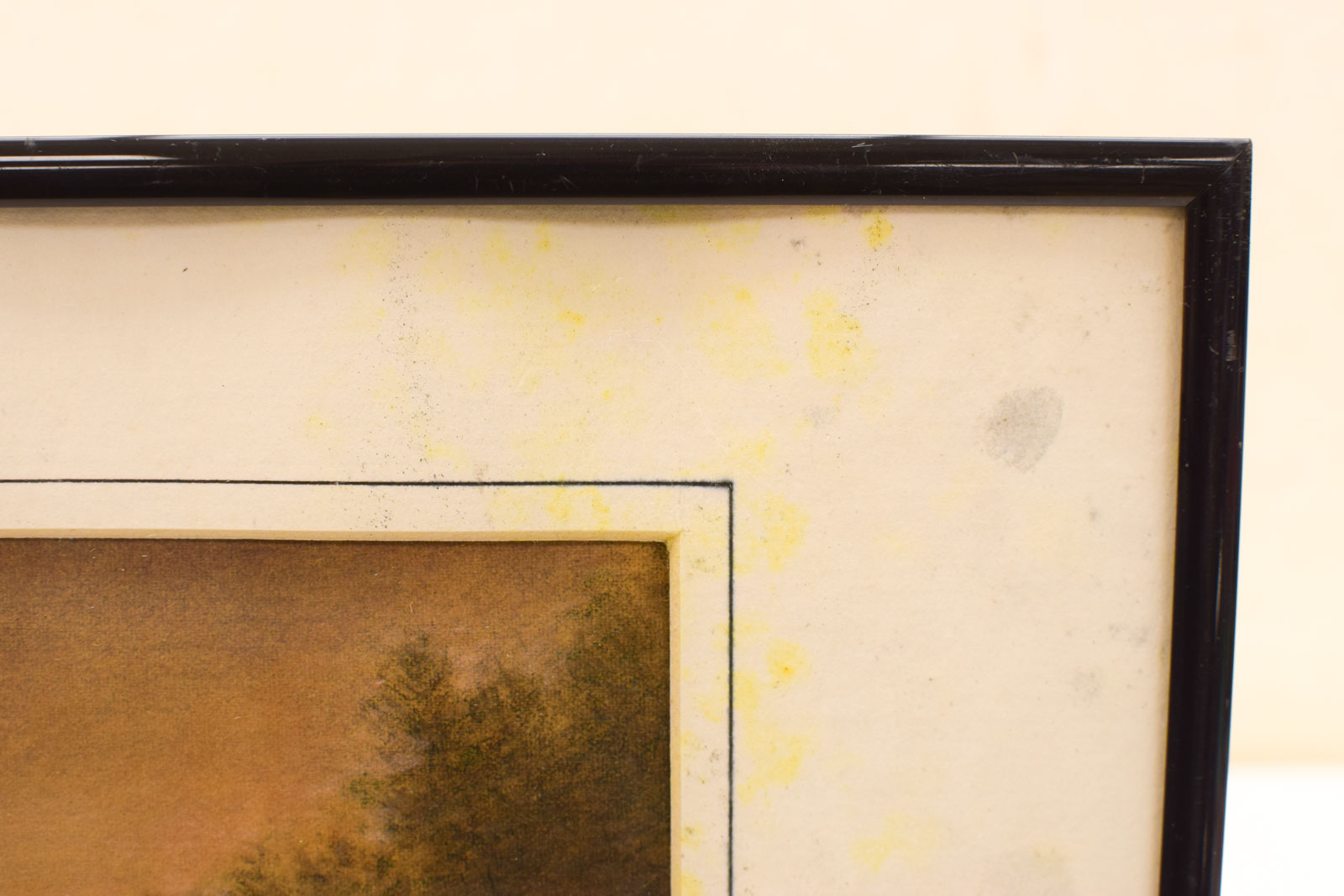 De pentekening heeft duidelijke sporen van ouderdom en gebruik. Het werk vertoont vlekken, verkleurde plekken en vochtschade, wat typisch is voor oudere werken die niet altijd optimaal zijn opgeslagen. Ondanks deze beschadigingen is het papier nog heel en intact. De afmetingen zijn 46 centimeter breed en 31 centimeter hoog, met 2 centimeter diepte door het frame.