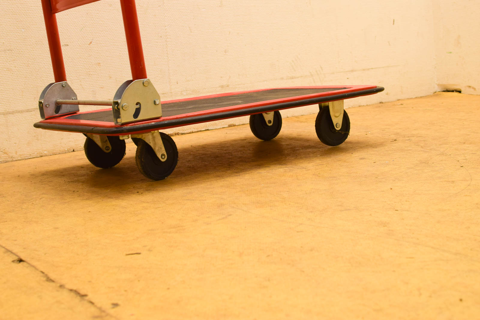 de platformwagen is gebruikt en heeft gebruikssporen maar rolt nog goed