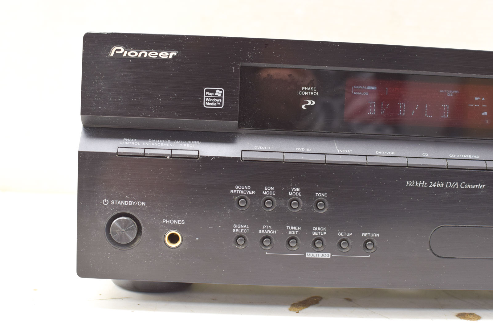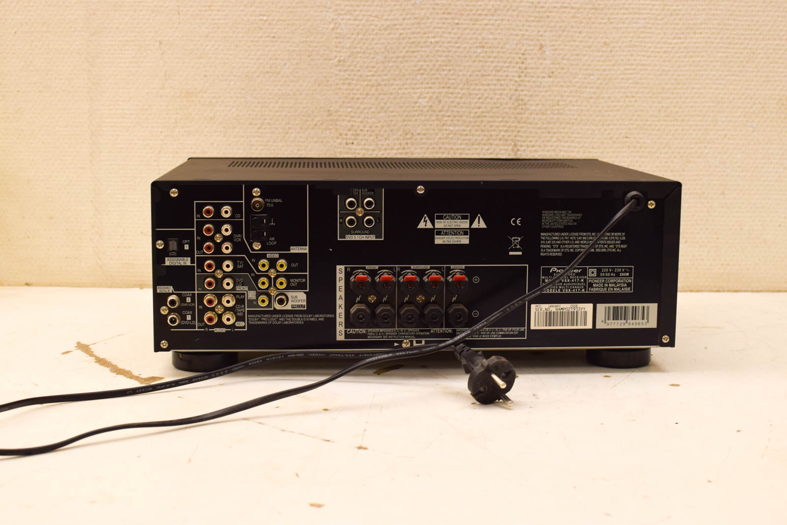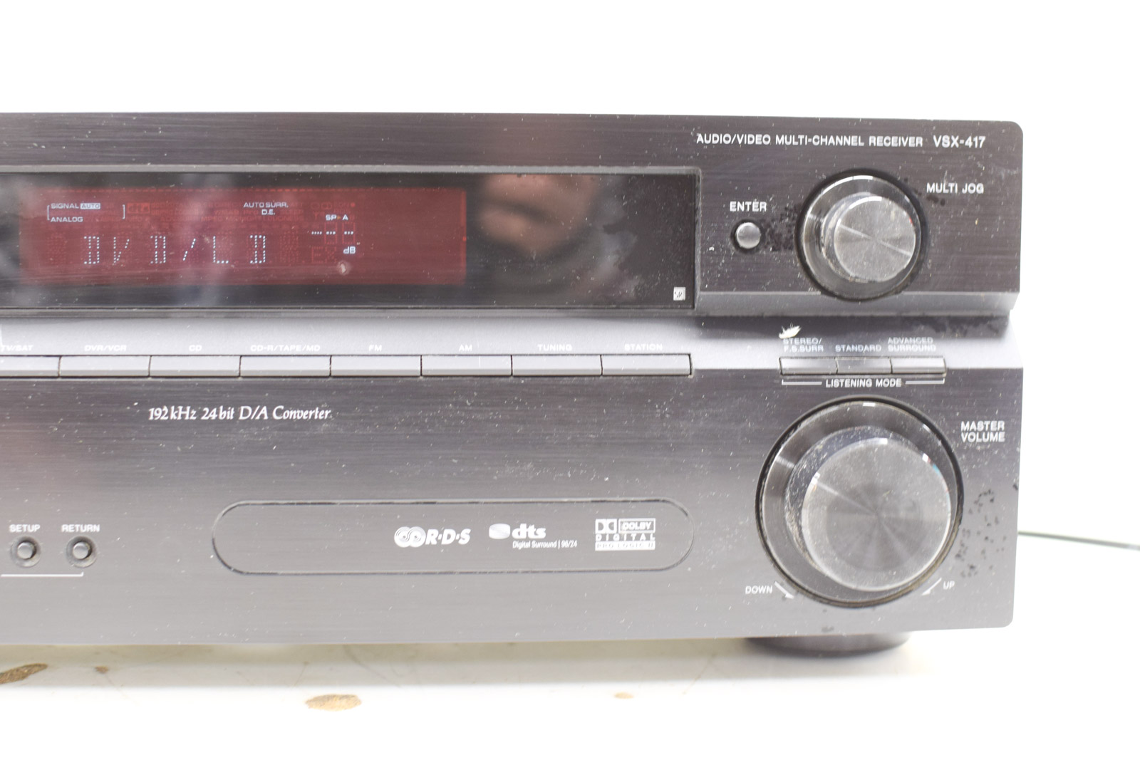 Dit is een Pioneer VSX-417, een audio video multi-channel receiver uit de jaren 90. Het apparaat is getest en werkt naar behoren. De Pioneer VSX-417 receiver ondersteunt verschillende audio en video bronnen en heeft ingebouwde surround sound mogelijkheden met Dolby Digital en DTS. De 24-bit D/A converter zorgt voor kwalitatieve geluidweergave.