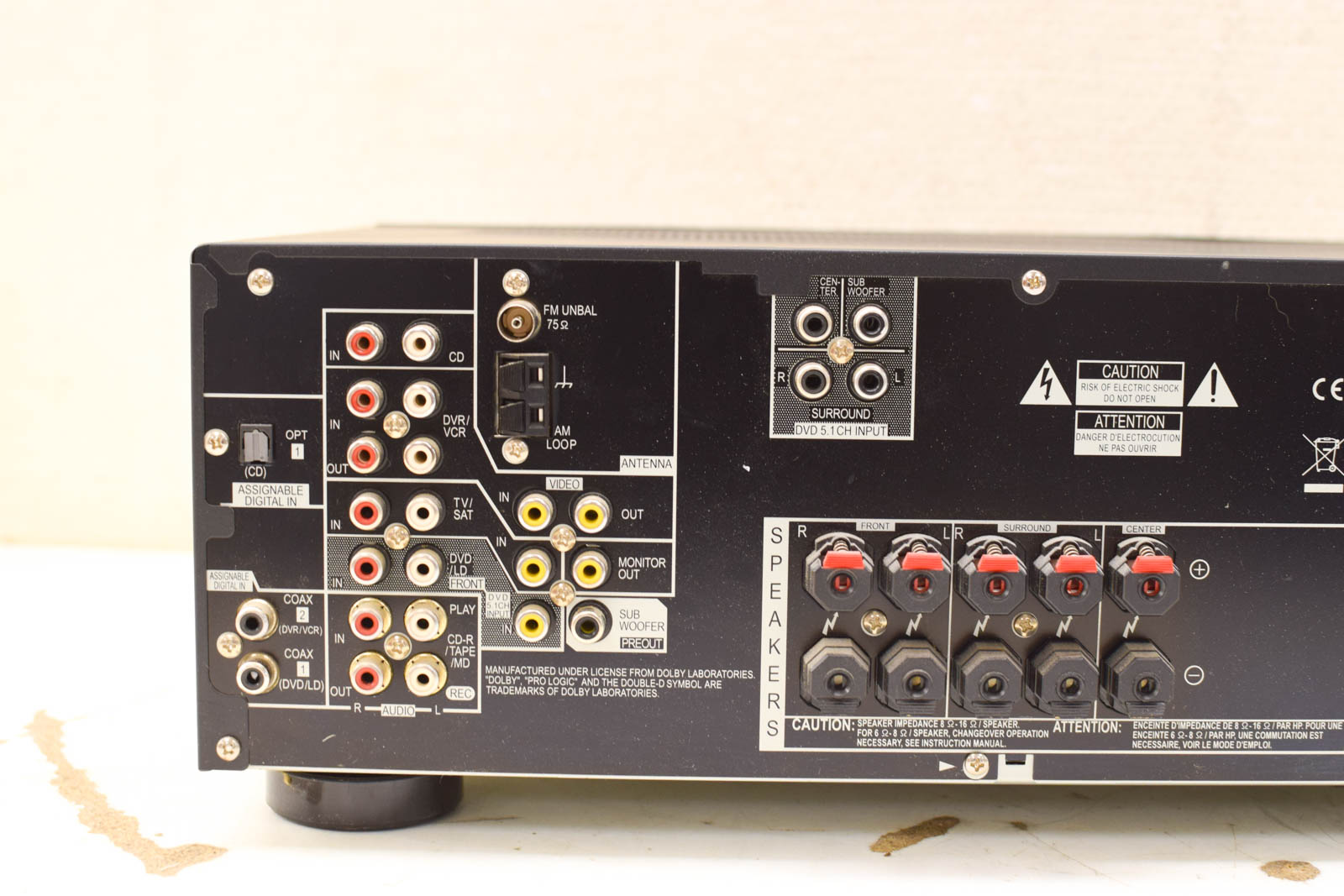 De receiver heeft uitgebreide aansluitingen op de achterkant: meerdere RCA-ingangen voor audio, video in- en uitgangen, coaxiale digitale aansluiting en speaker terminals voor surround geluid. Vooraan vind je de hoofdvolume knop, een telefoonsaansluiting, en diverse bedieningsknoppen voor tuner, signaalselectie en menu navigatie. Het front display toont duidelijk de huidige instellingen.