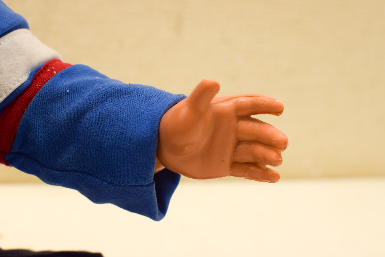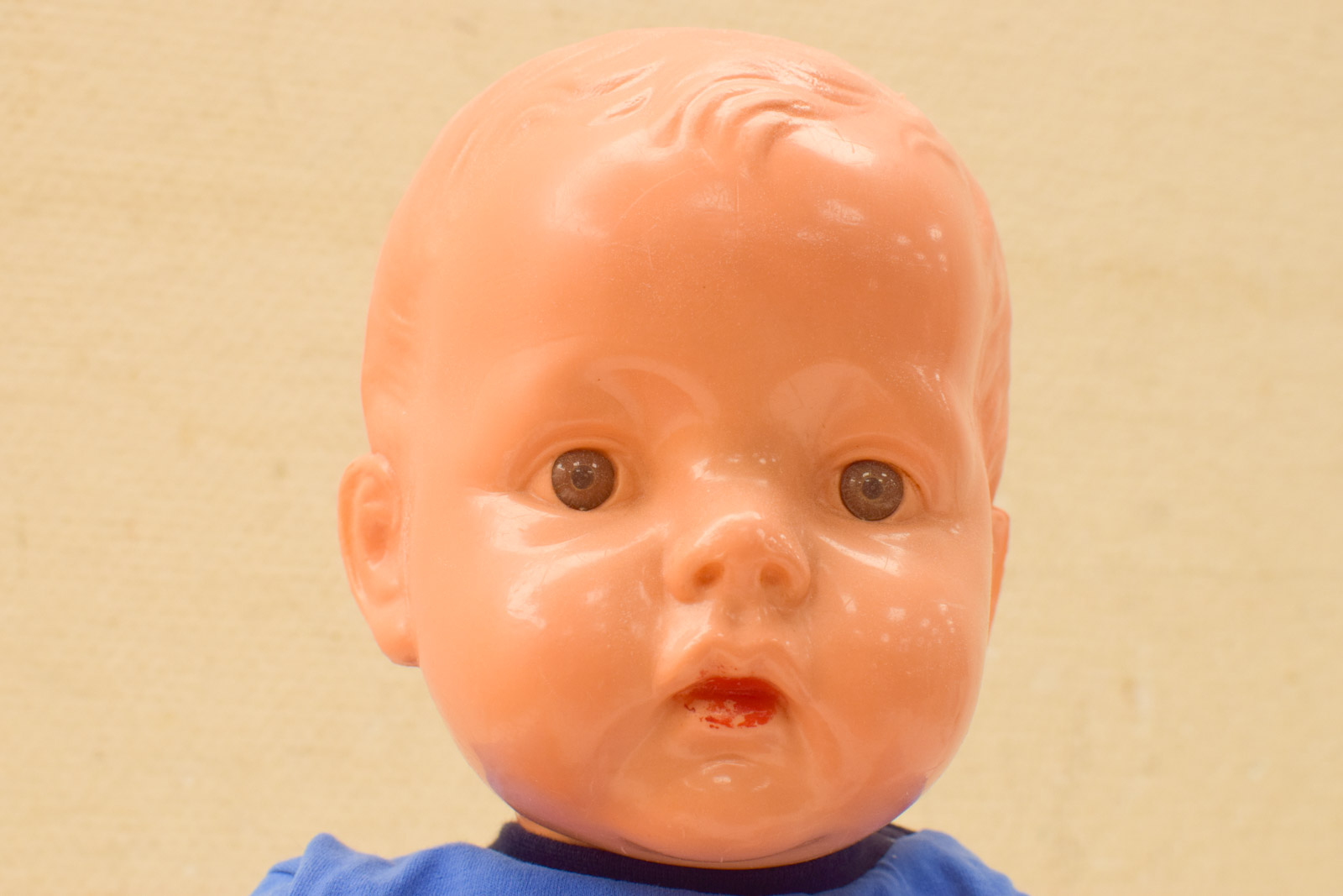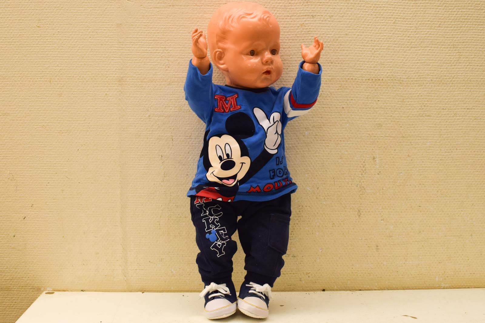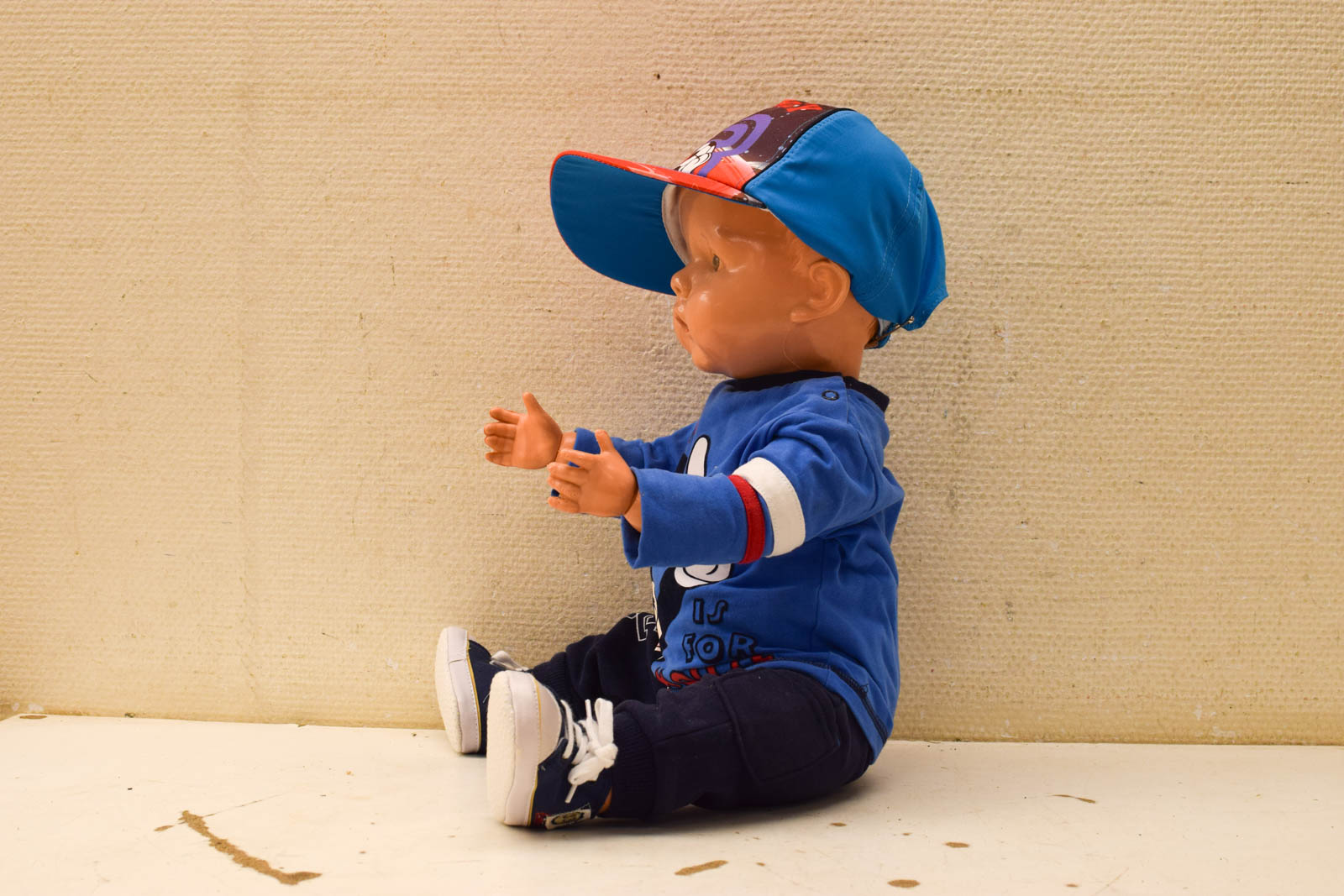 de pop is van plastic het merkje is niet te lezen heeft slijtage op het verf en heeft een beschadiging op het hoofd de kleur wijkt af van de foto