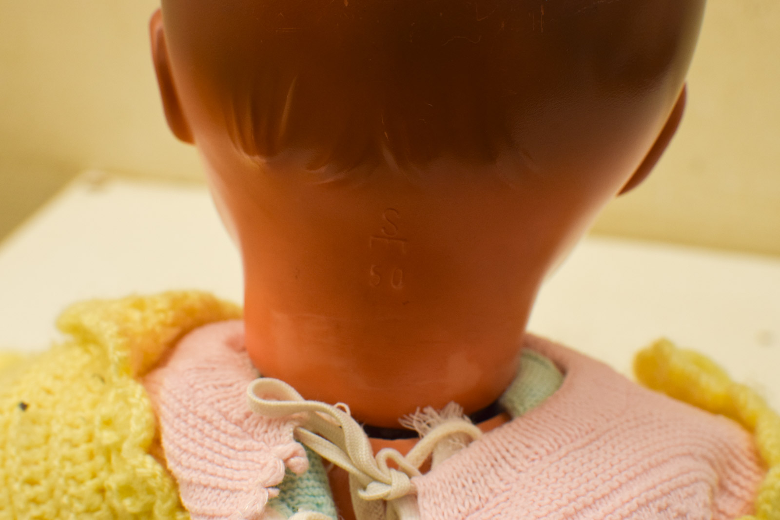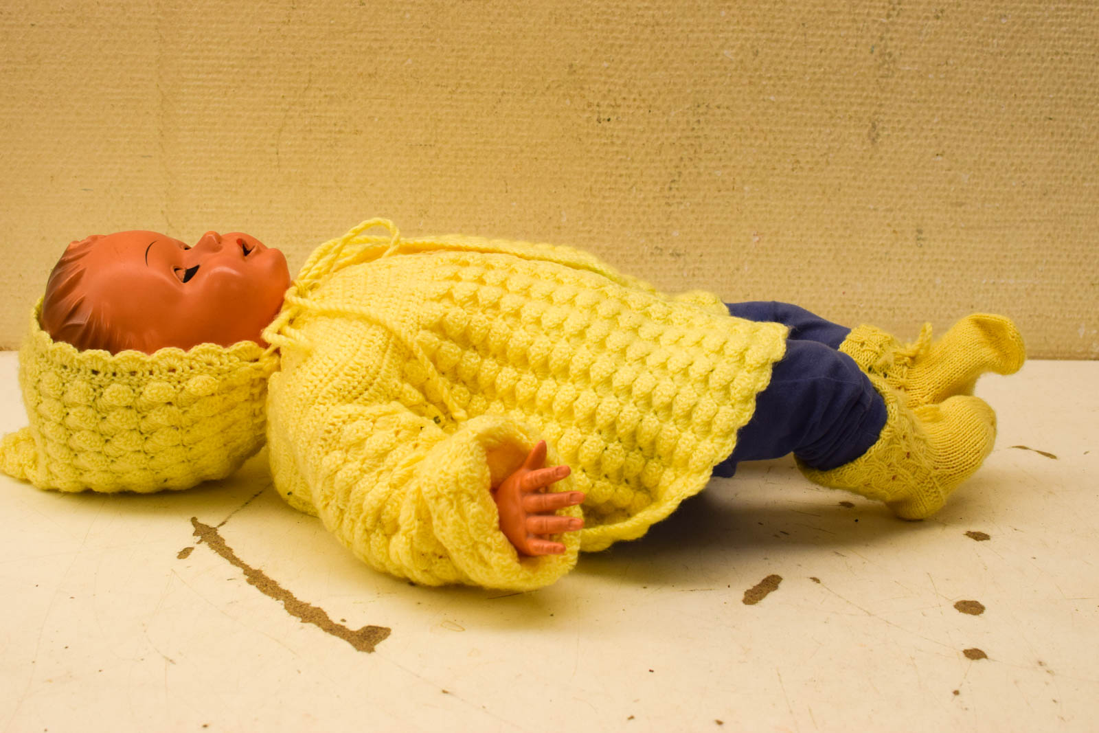 met de pop is gespeeld en heeft gebruikssporen is van plastic en slijtage op het verf