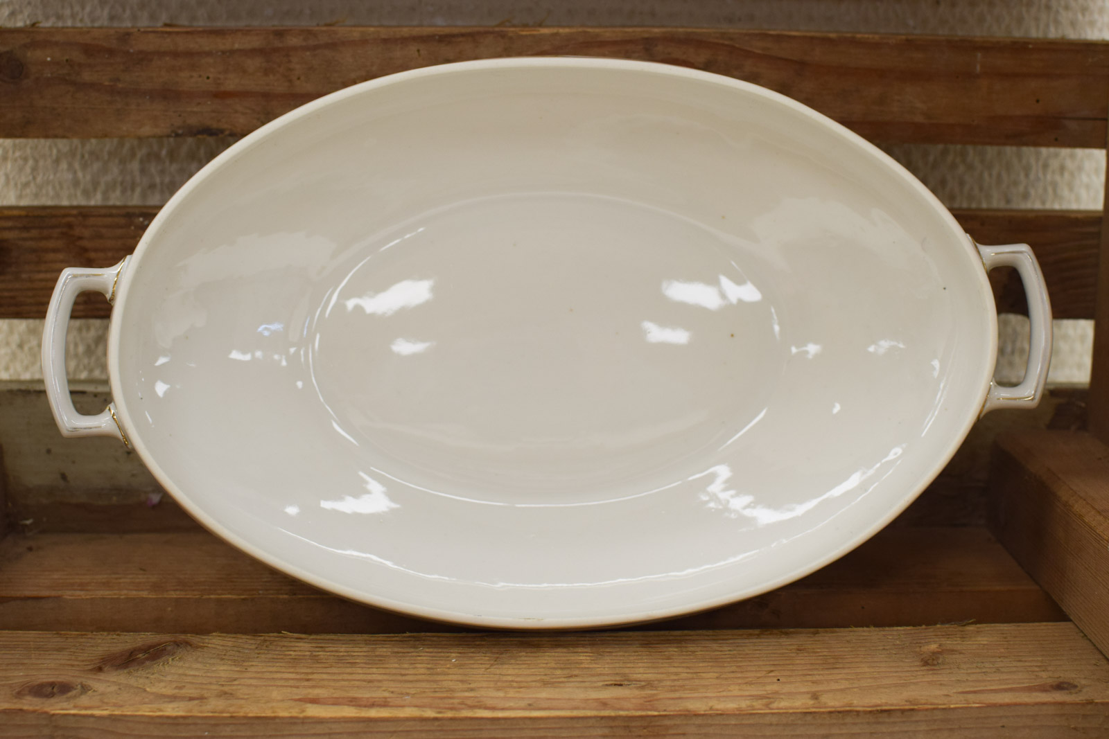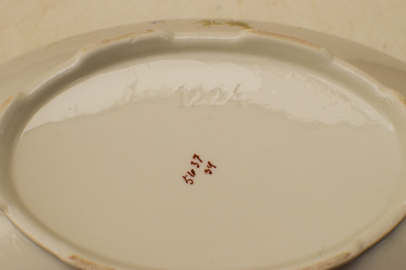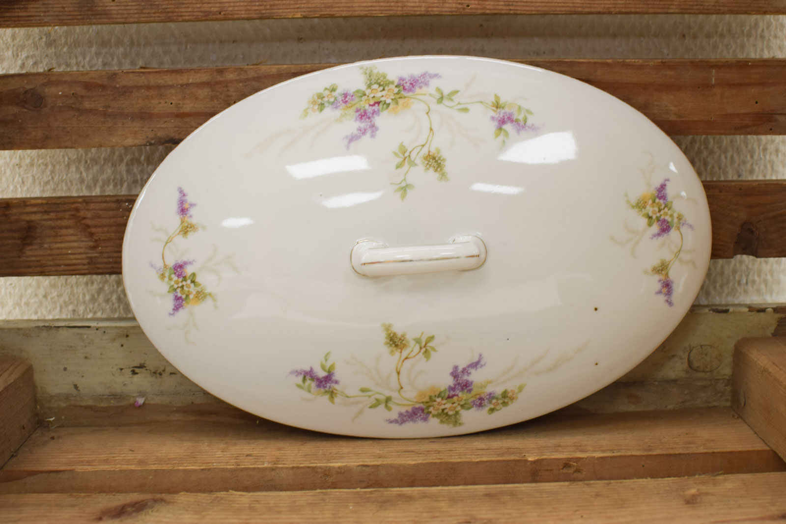 op de onderkant staan de cijfers 1224 gemeten van oor tot oor 29 cm gemeten zonder deksel hoog 7 cm heeft slijtage op het geverfde randje het servies heeft een enkele zwarte vlekjes