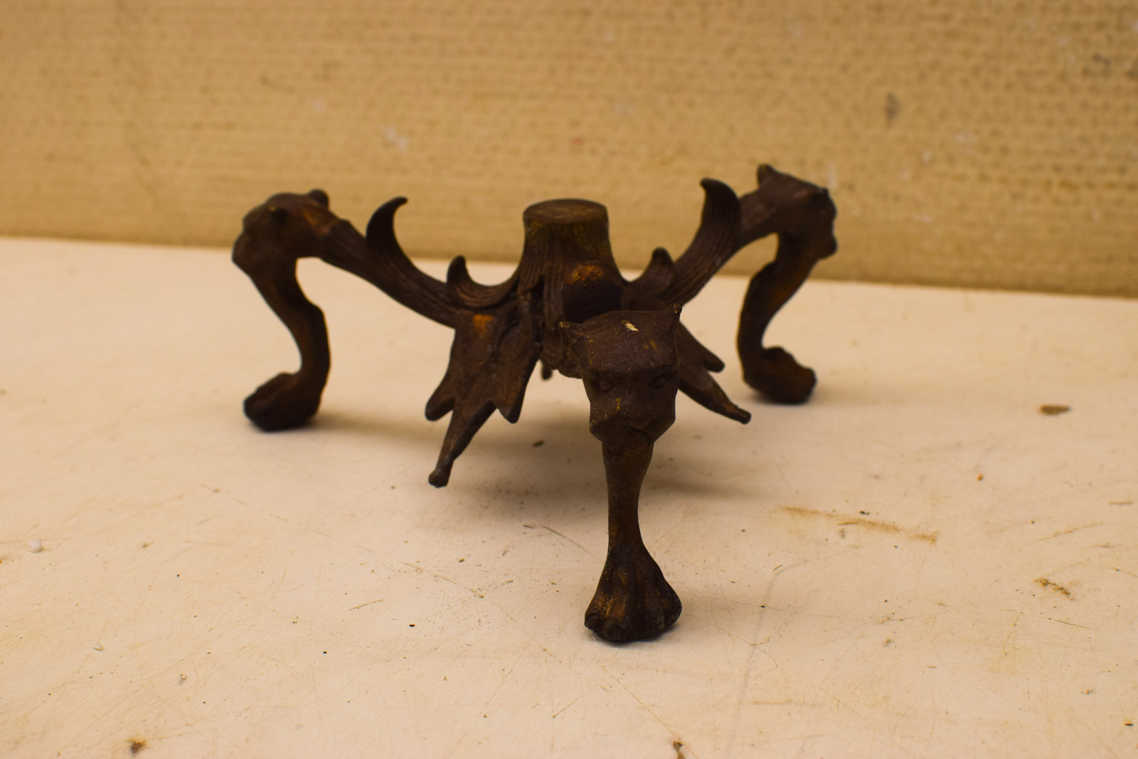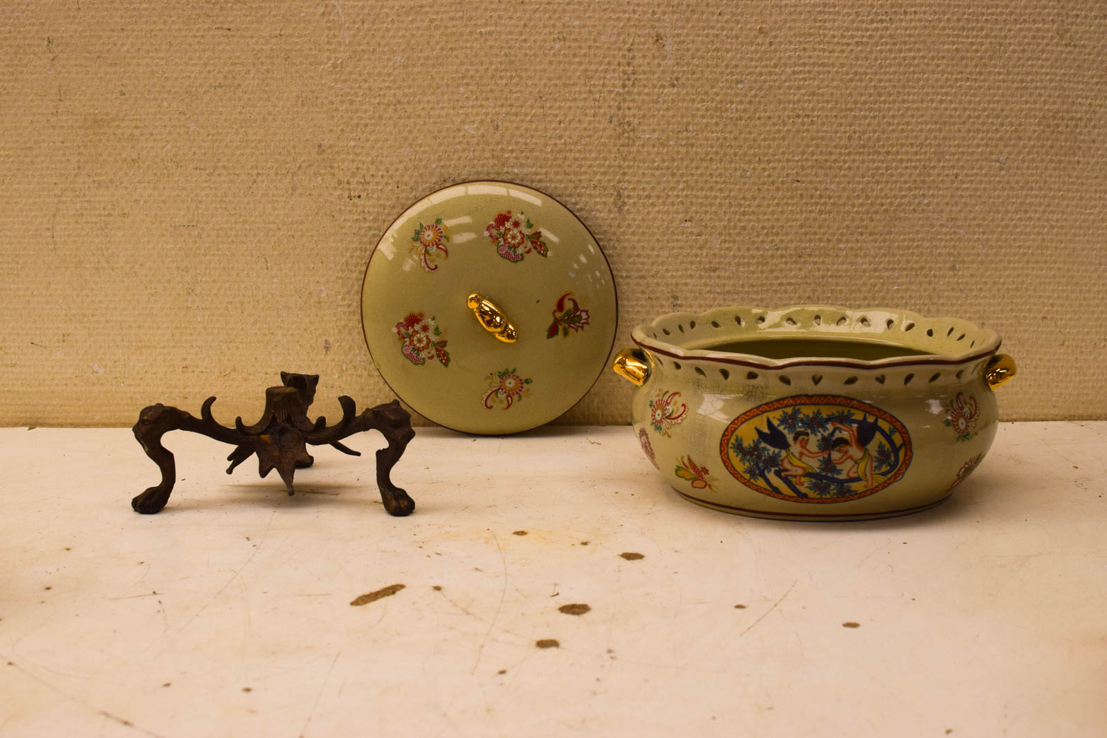 Het gietijzeren onderstel heeft een sierlijke, organische vorm met drie gebogen poten en een uitgewerkt middengedeelte. Dit soort voetjes is kenmerkend voor 18de- en 19de-eeuwse Europese serviesstukken waar Aziatische porseleinschotels vaak op werden gemonteerd. Het contraast tussen het delicate porselein en het robuuste ijzer typeerde de victoriaanse smaak.