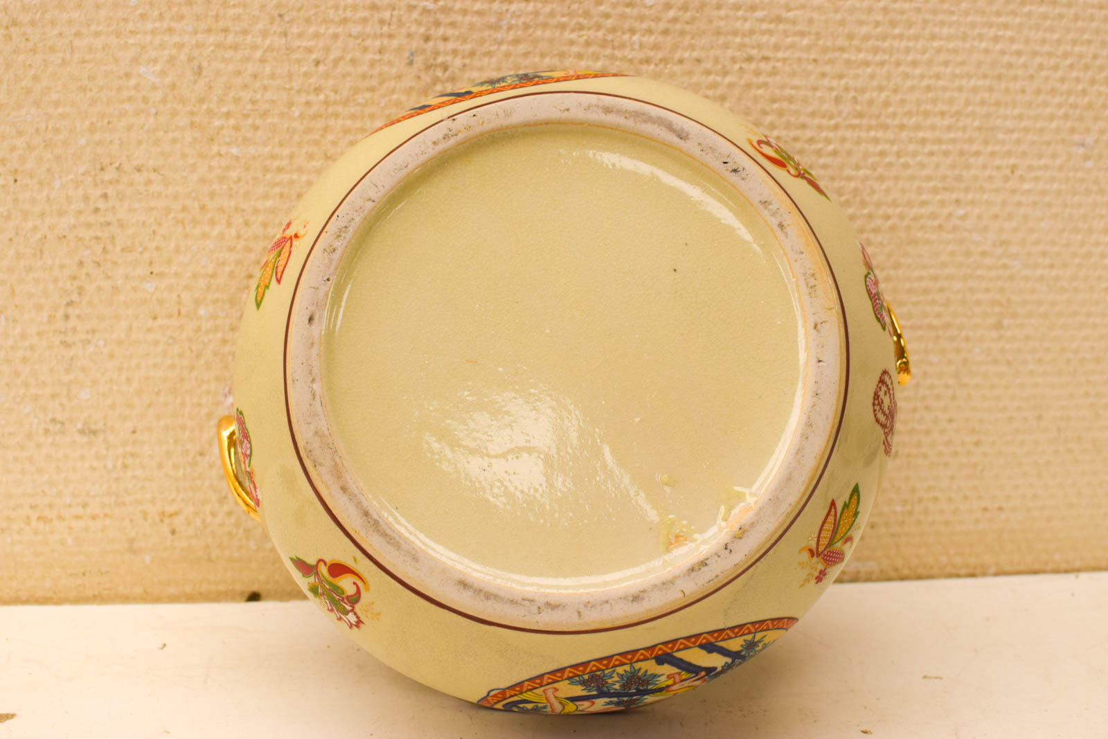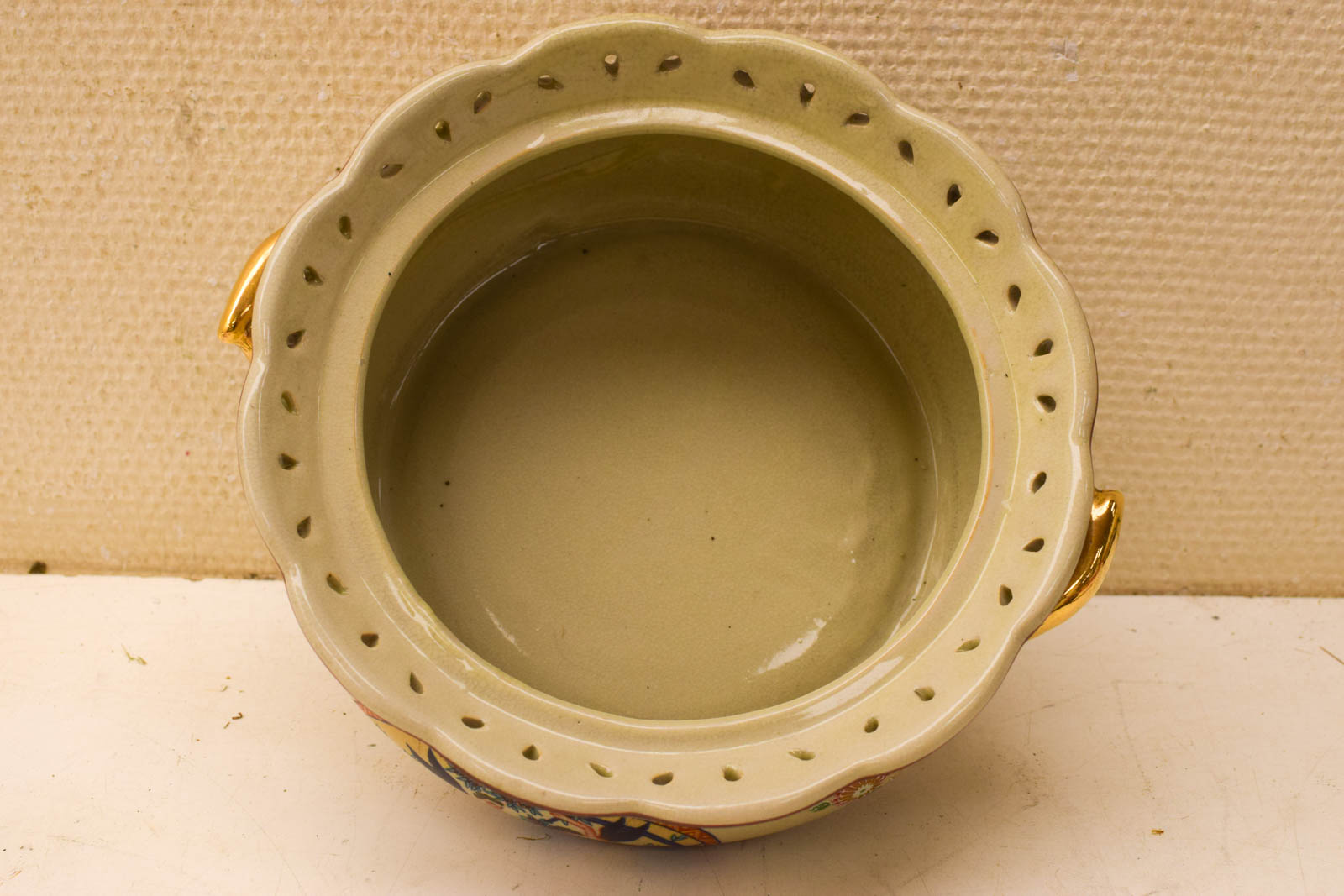Deze porseleinen afdekschaal op voet is een decoratief serviesstuk met Aziatisch-geïnspireerd design. Het porselein heeft een creme-witte kleur en is voorzien van handgeschilderd decor met twee figuren in een ovaal cartouche, omgeven door bloemmotieven in rood en geel. De rand is afgewerkt met een golvende rand en pijnlijke perforatie.