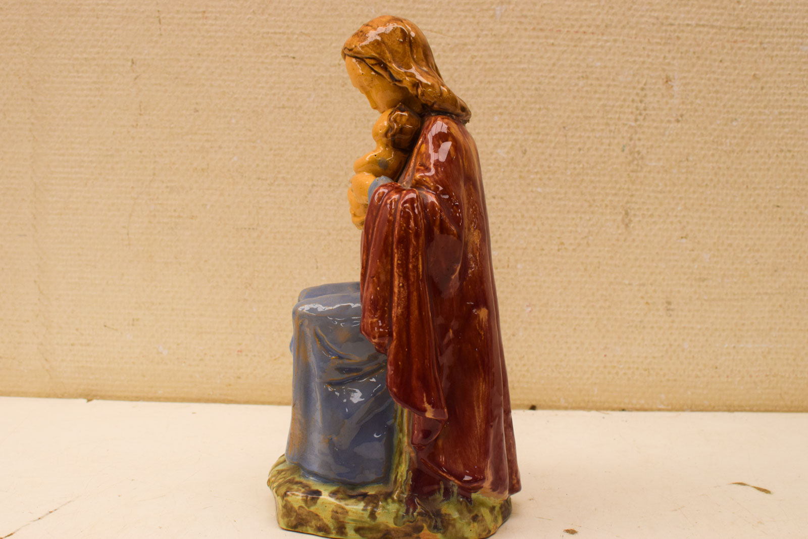 Dit porseleinen beeld stelt een moeder met kind voor. Het is ongeveer 32 cm hoog en gemaakt van porselein met handgeschilderde details. De moeder draagt een rode mantel over een donkerblauwe jurk, het kind is in geel gekleed. Het beeld staat op een gele voet.