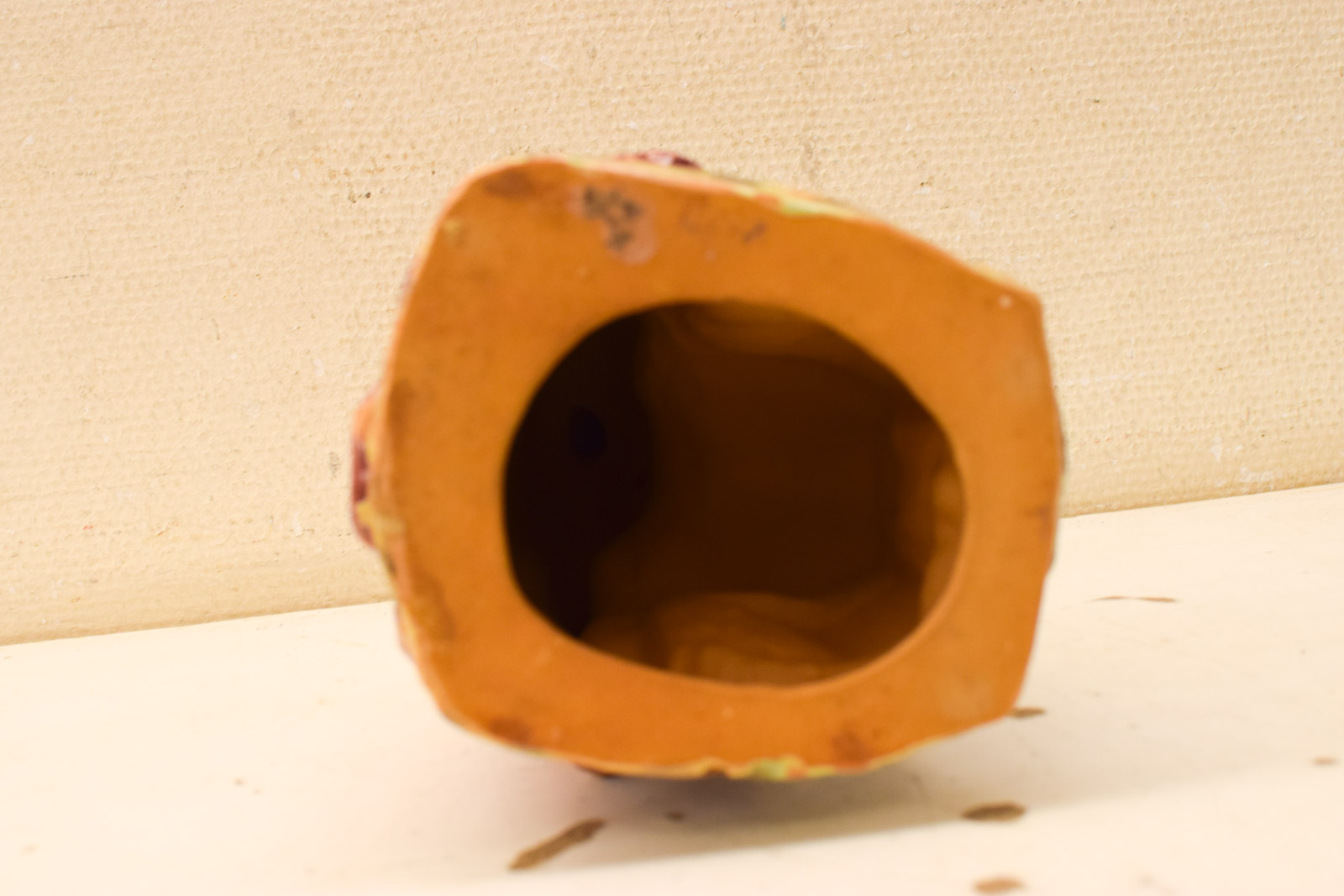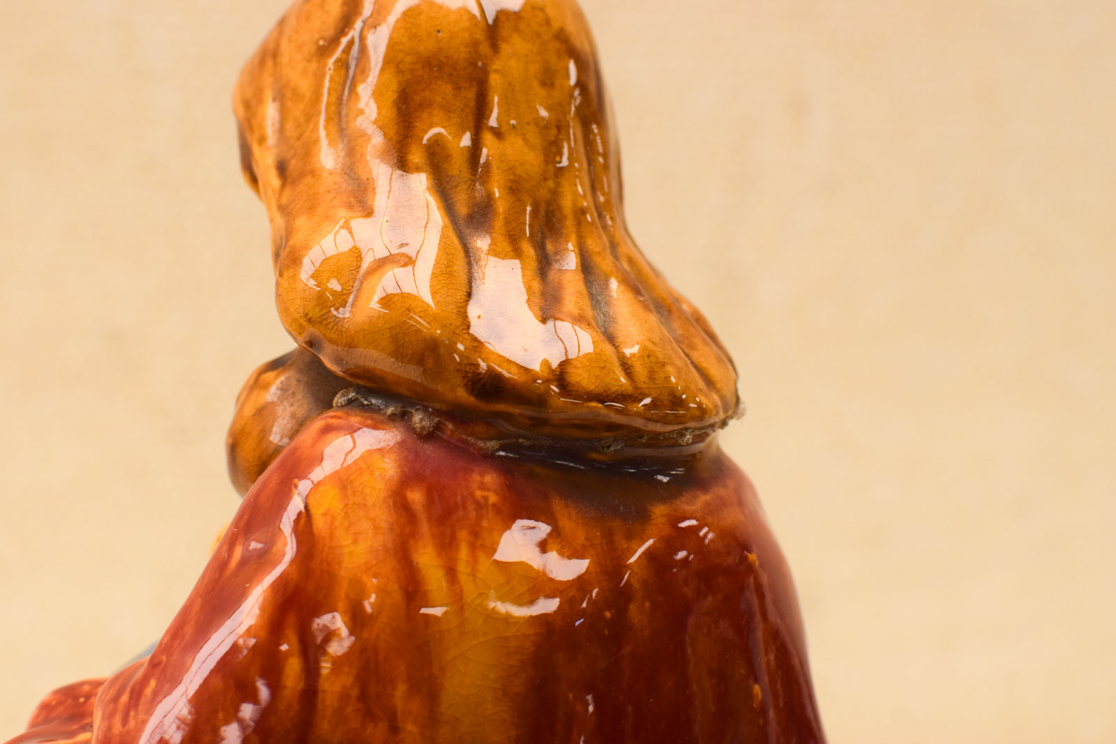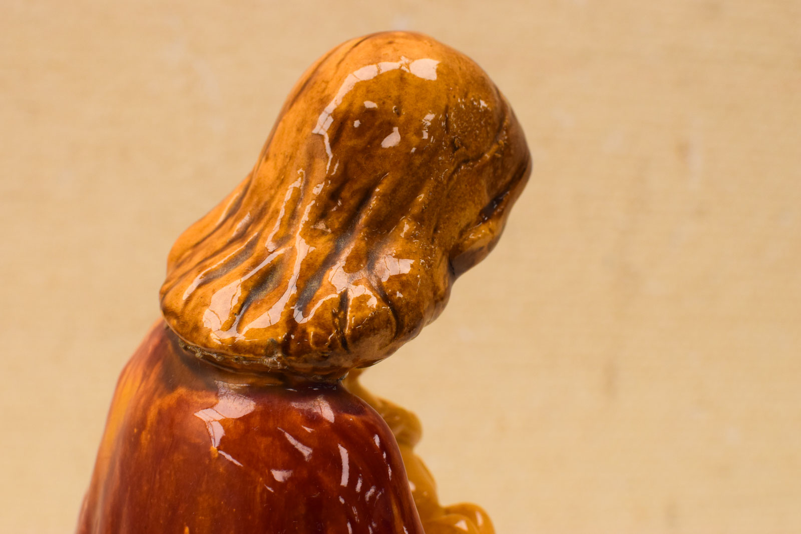 Aan het beeld zijn gebruikssporen zichtbaar. Op de rode mantel en het gele kinderdeel zijn enkele beschadigingen te zien: plekken waar de glazuur is afgelaten of ontbreekt, waardoor het materiaal eronder zichtbaar wordt. Dit zijn kenmerkende kenmerken van tweedehandsporselein dat jarenlang in gebruik is geweest. De kleuren wijken mogelijk iets af van hoe ze in werkelijkheid ogen, afhankelijk van licht en fotografie.