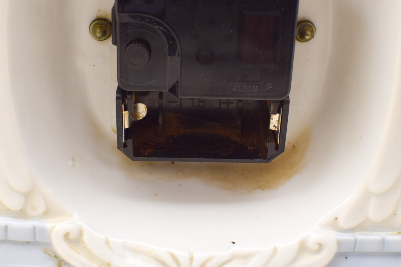 werkt op grote batterij de klok is loop of sloop de gedeelte waar de batterij in moet heeft aanslag/roest