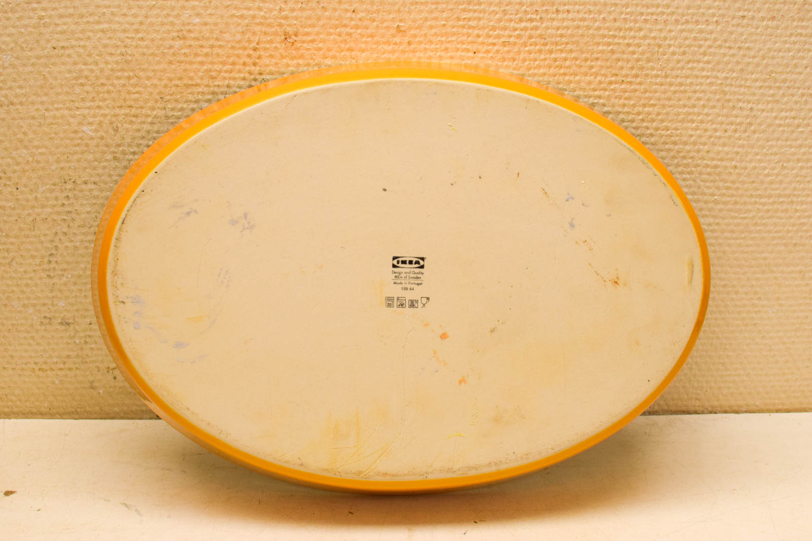 kleur geel/oranje de schaal heeft krassen aan de binnenkant de schaal is nog heel breed 38,5 cm diepte 27 cm hoog 6 cm