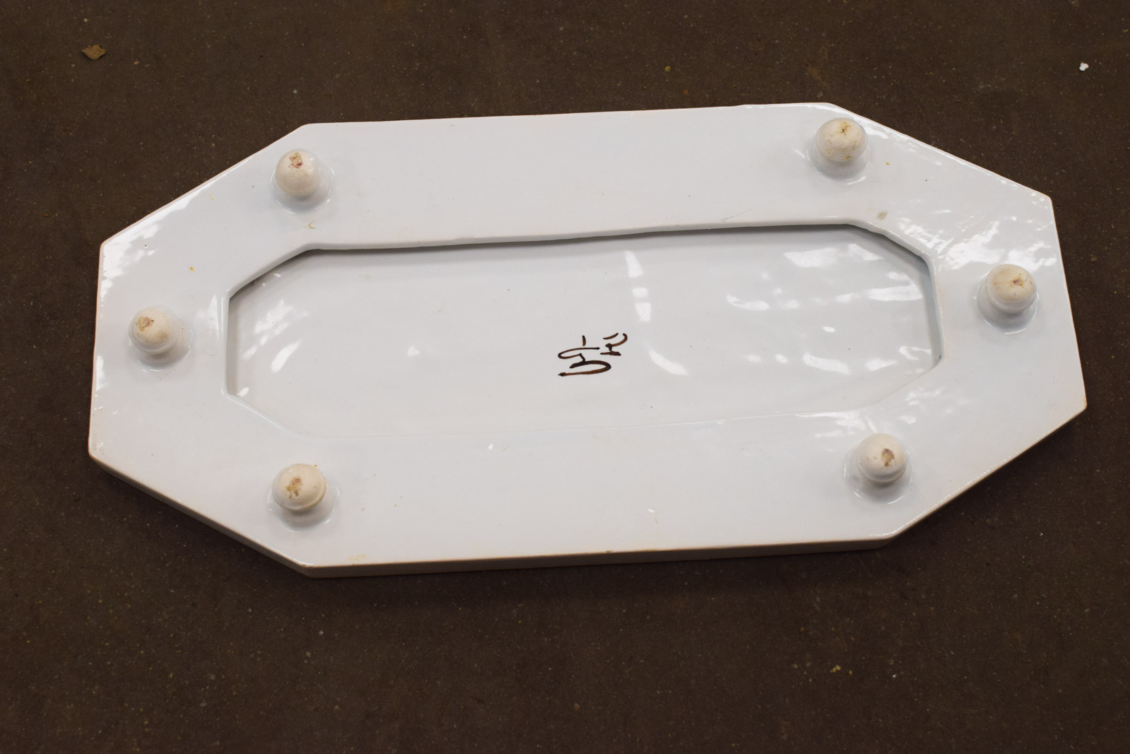 De afmetingen zijn 37 cm breed, 18 cm diep en 4 cm hoog, wat het een handige maat maakt voor het serveren of presenteren van eten. Het porselein is voorzien van een bruine rand aan de bovenste zijde. Dit type servies hoort thuis in een retro of vintage interieur, typisch voor mid-century tafelcultuur wanneer ambachtelijk beschilderd servies nog gemeengoed was in Nederlandse huishoudens.