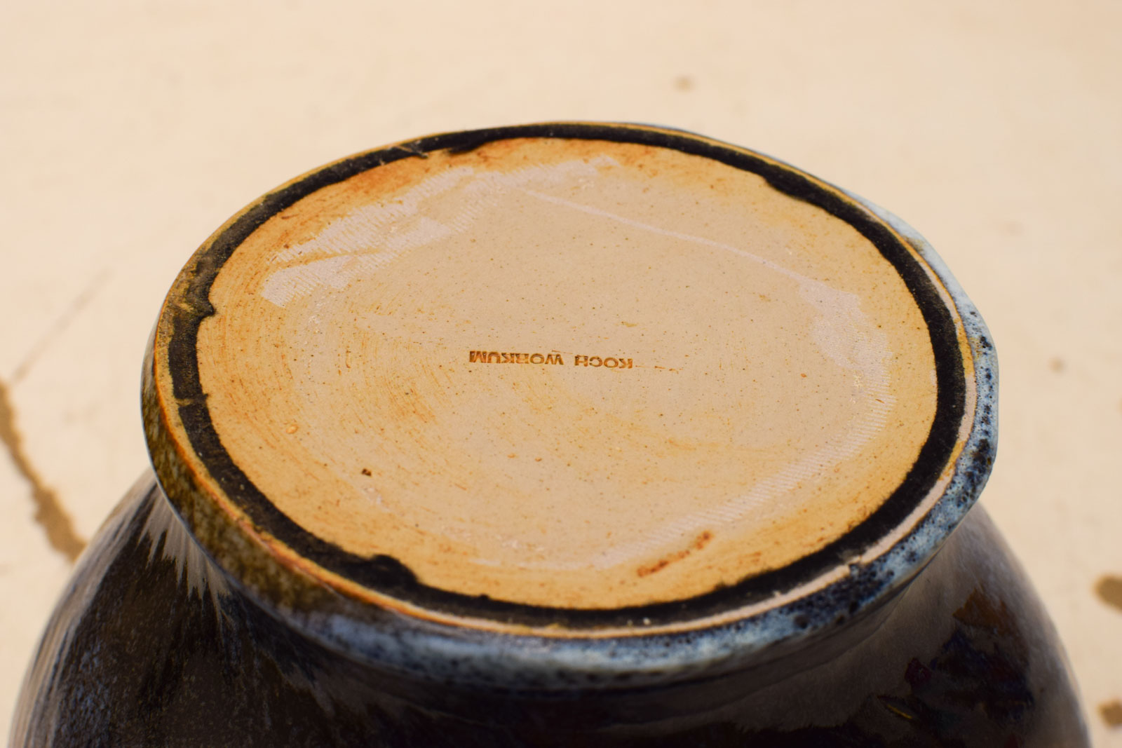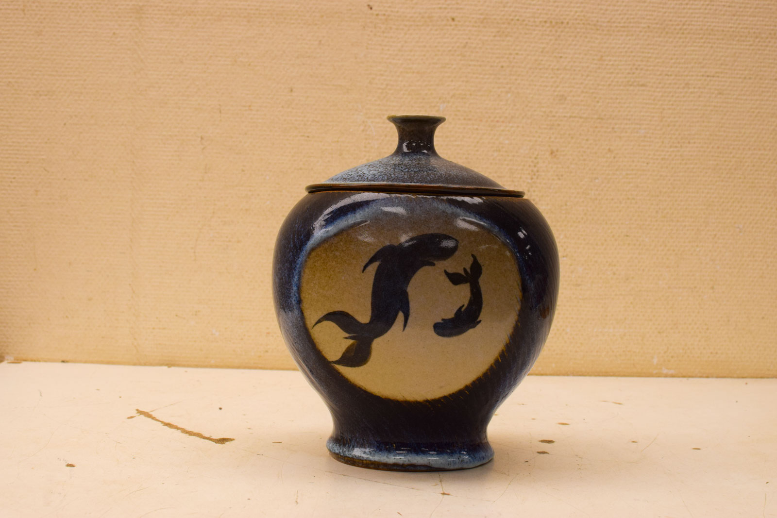 heeft aan de voorzijde een prent met 3 dolfijntjes Bovenkant opening breed 17,5 cm diepte 17 cm gemeten zonder deksel hoog 21 cm de pot ziet er nog netjes uit de andere kant een prent met een mama en kind vis