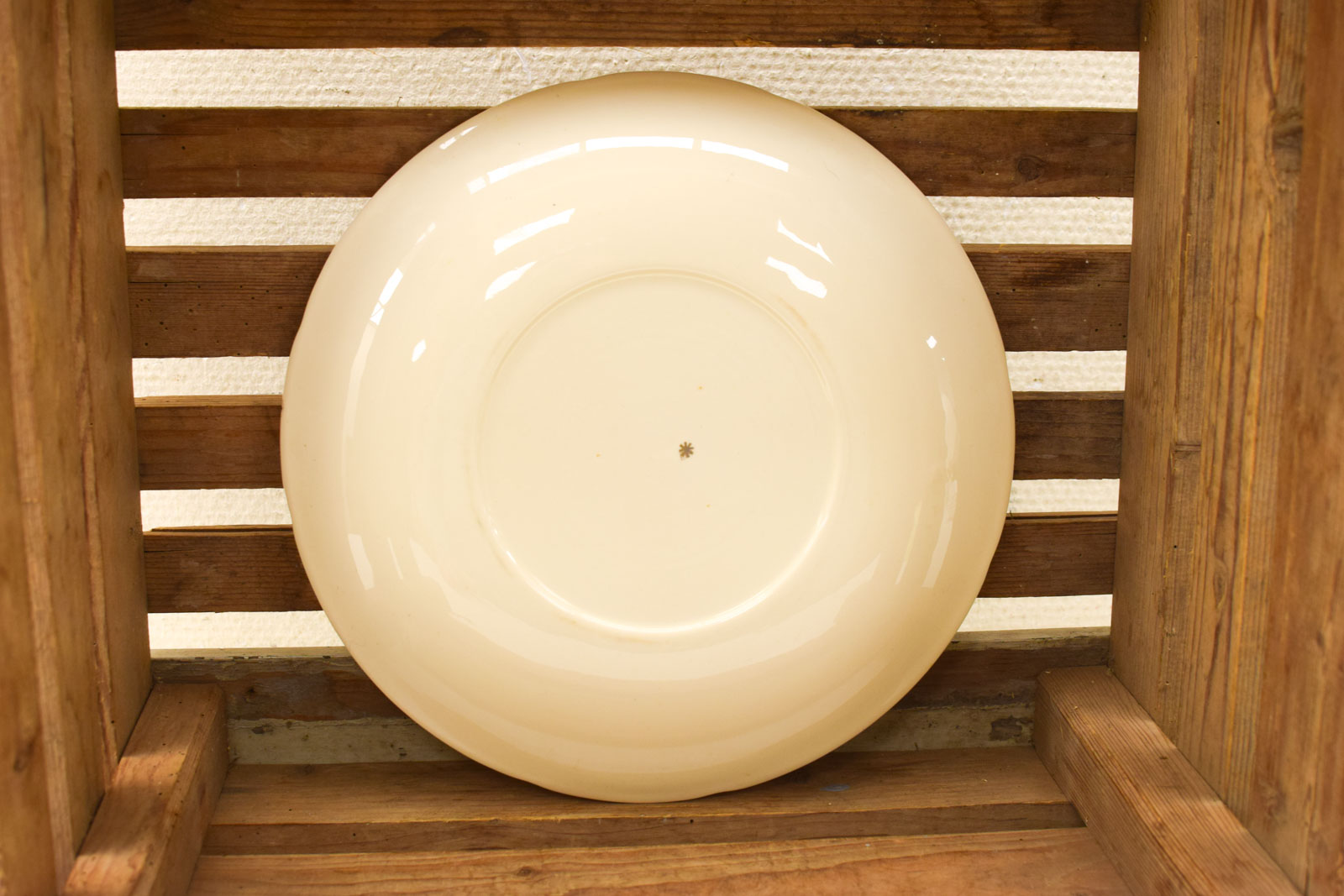 kleur beigje/geel de schaal heeft vlekjes en lichte krasjes diameter van de schaal 28,5 cm hoog 3 cm