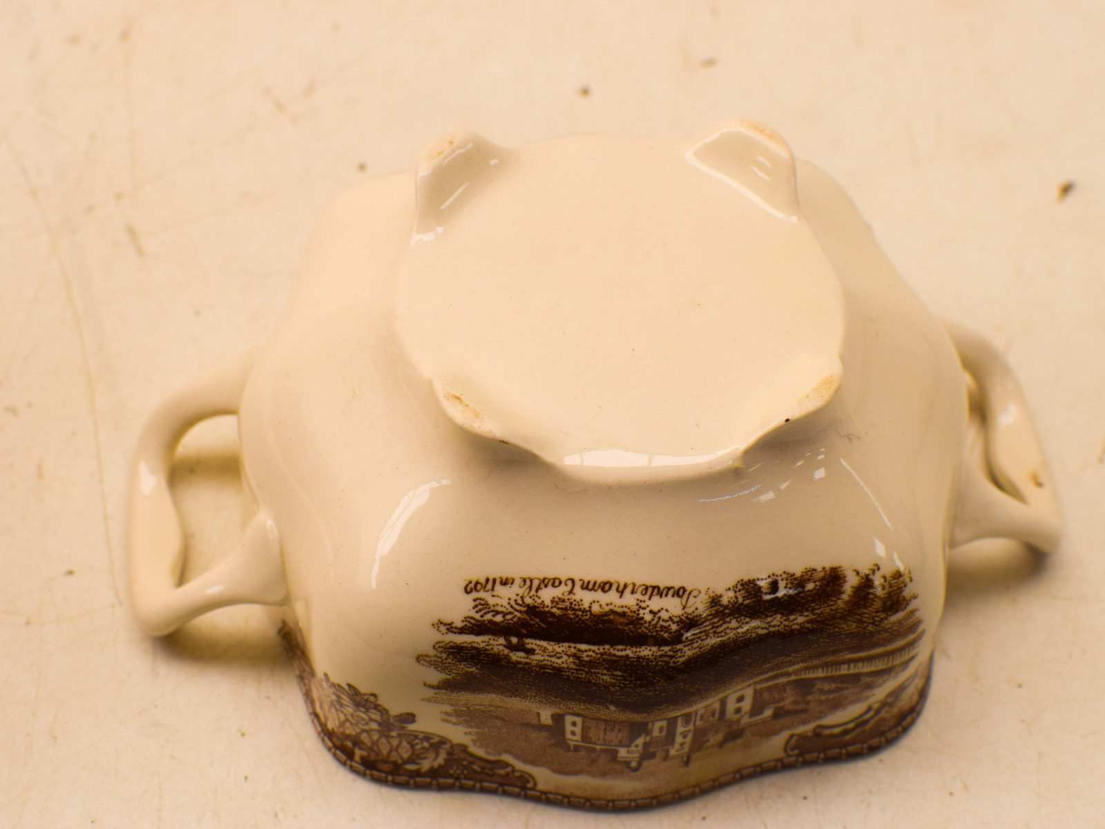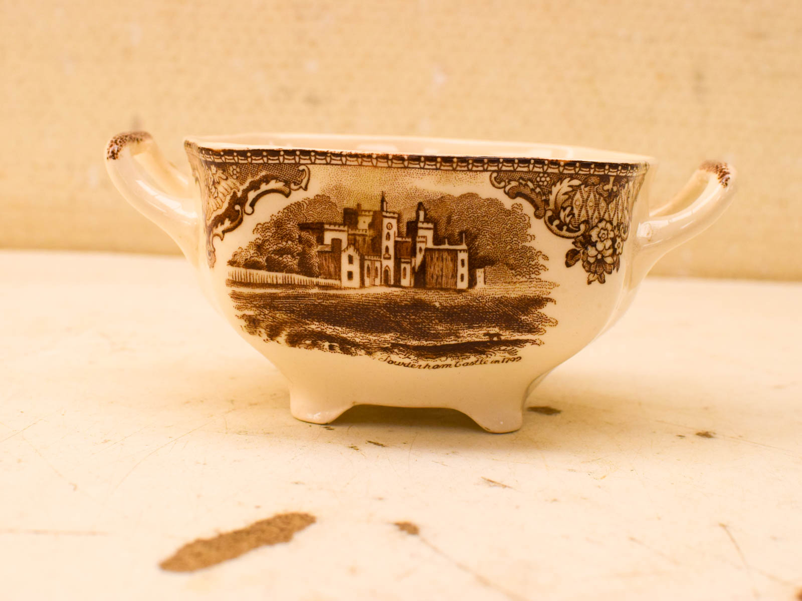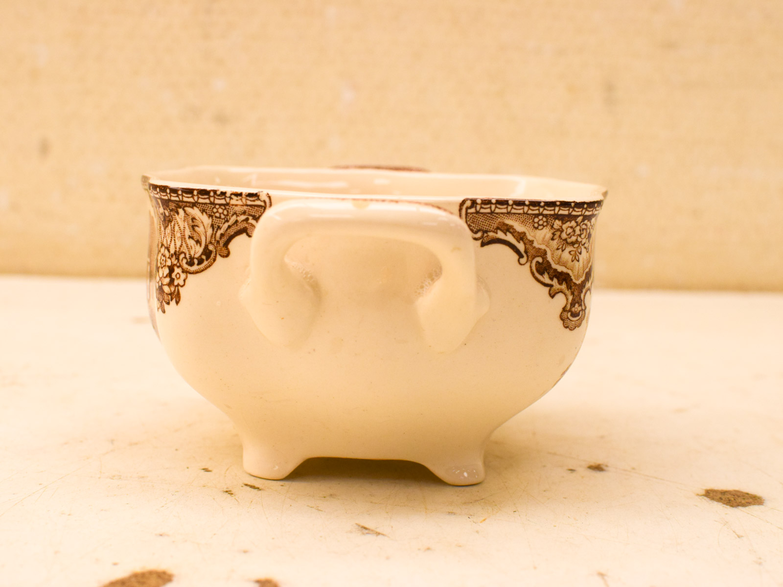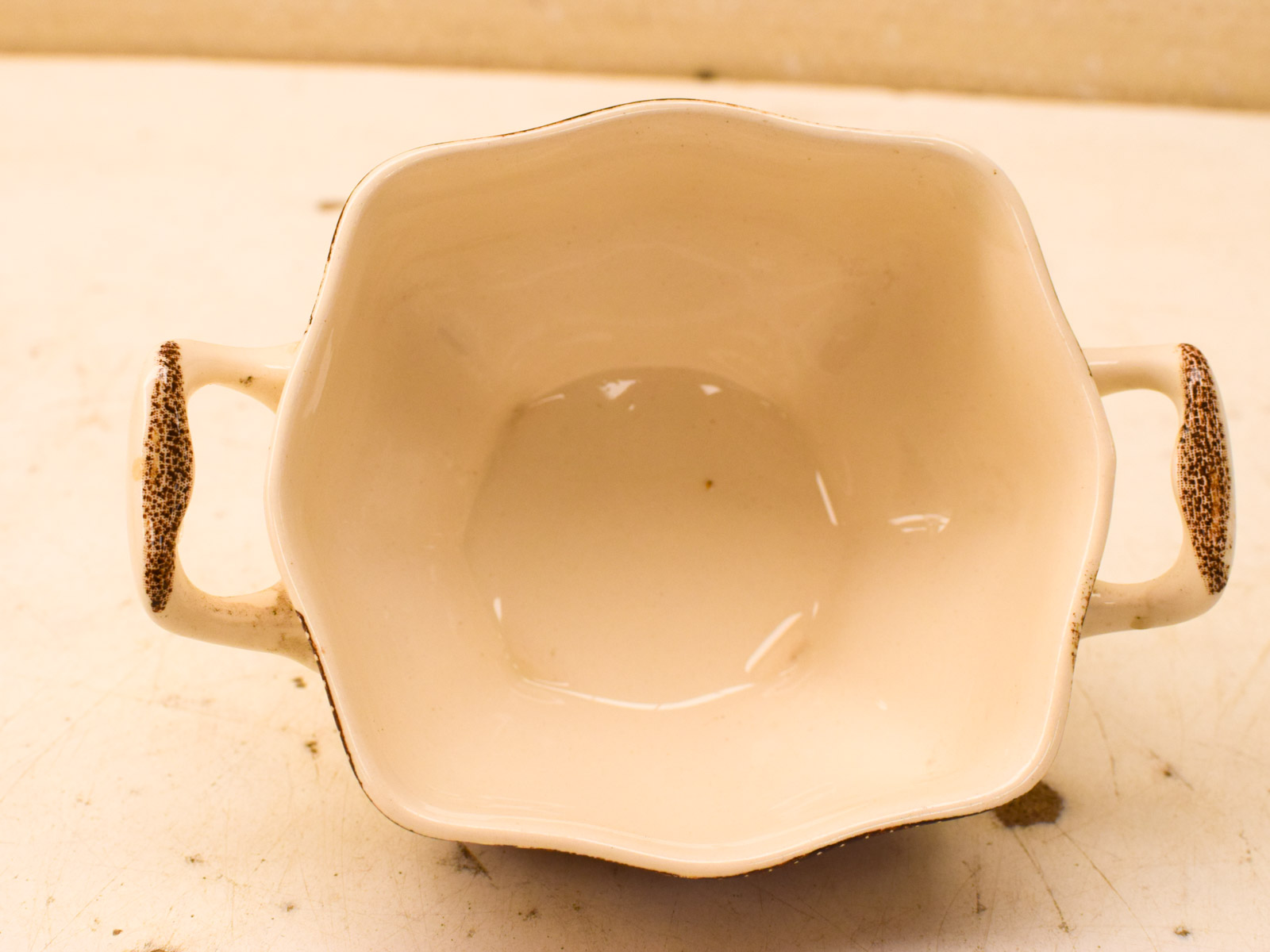 Dit vintage porseleinen schaaltje met oren is een leuk stuk servies uit een voorbije tijd. Het bruinwitte schaaltje heeft een mooie transferafdruk met landschapsmotieven en decoratieve ornamenten in de hoeken. De vorm met twee oren maakt het een praktisch en sfeervol stukje voor de keukenkast.