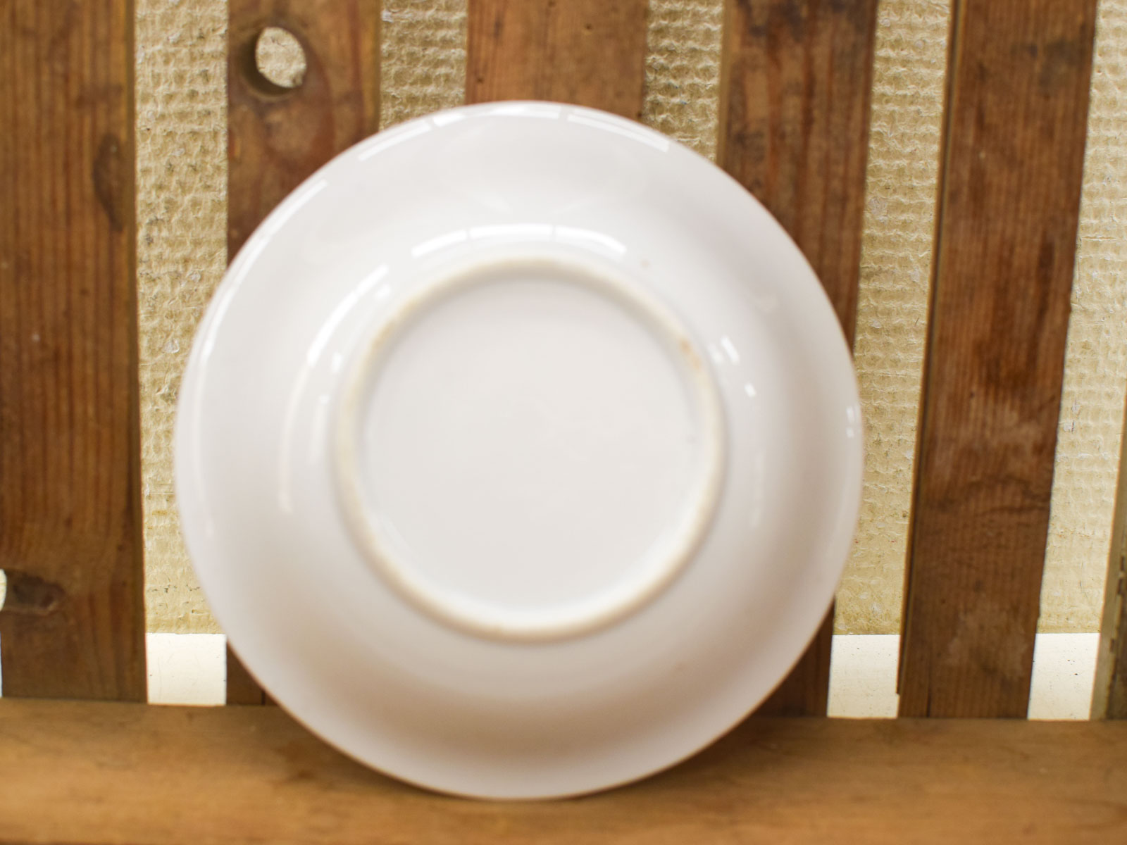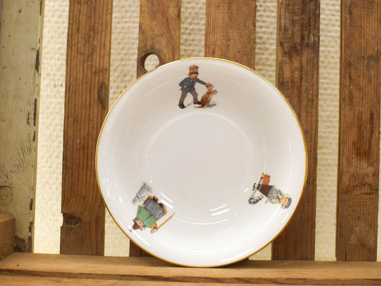 Heeft een prent personen met dieren het schaaltje heeft lichte krasjes maar ziet er verder nog redelijk uit en is heel