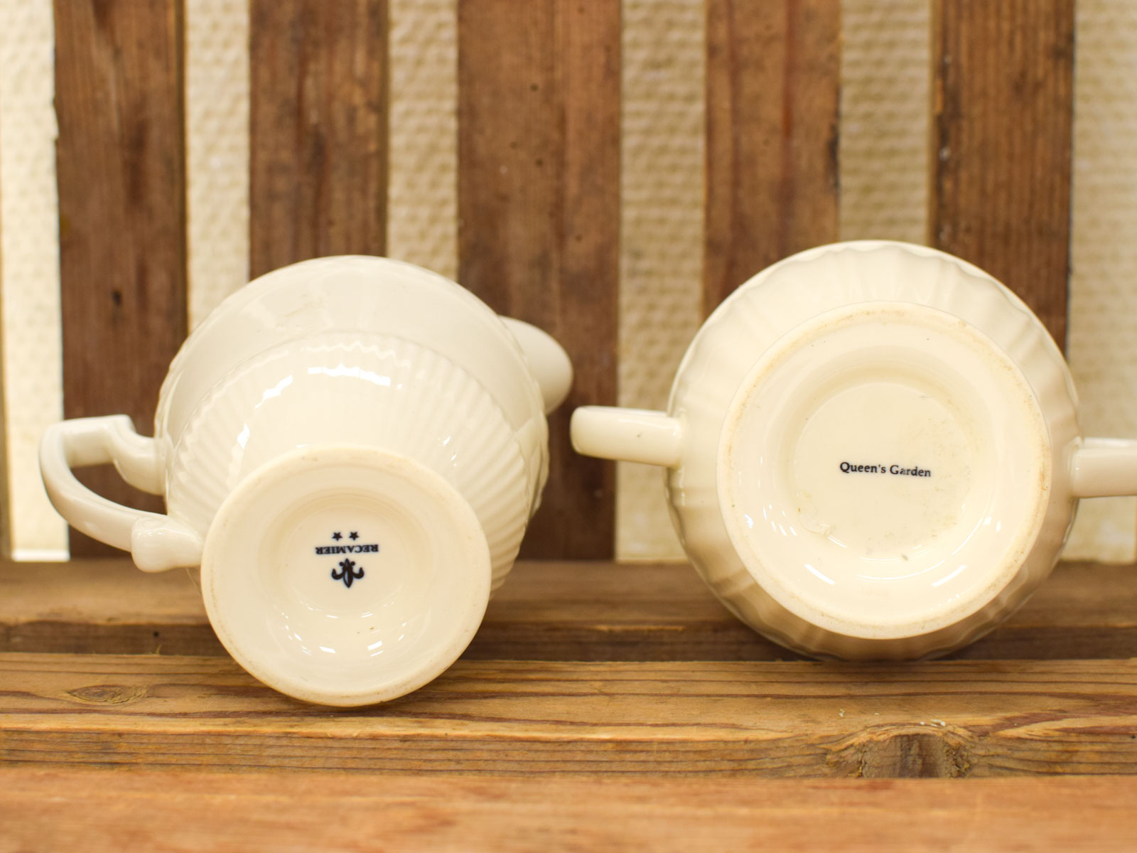 Het suikerpotje is van het merk Queen Garden gemeten zonder deksel van oor met oor breed 12.5 hoog 8 cm het melkkannetje heeft het merk Recamier gemeten van tuit met oor 12 cm hoog 10,5 cm zien er allebei nog redelijk netjes uit