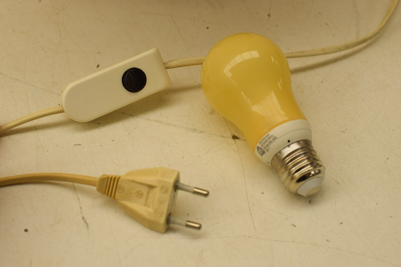 het porselein heeft wat vlekken maar de lamp is nog heel de lampenkap is aan de binnenkant van plastic de buitenkant van stof de bovenkant van de kap heeft beschadigingen de kap heeft vlekjes