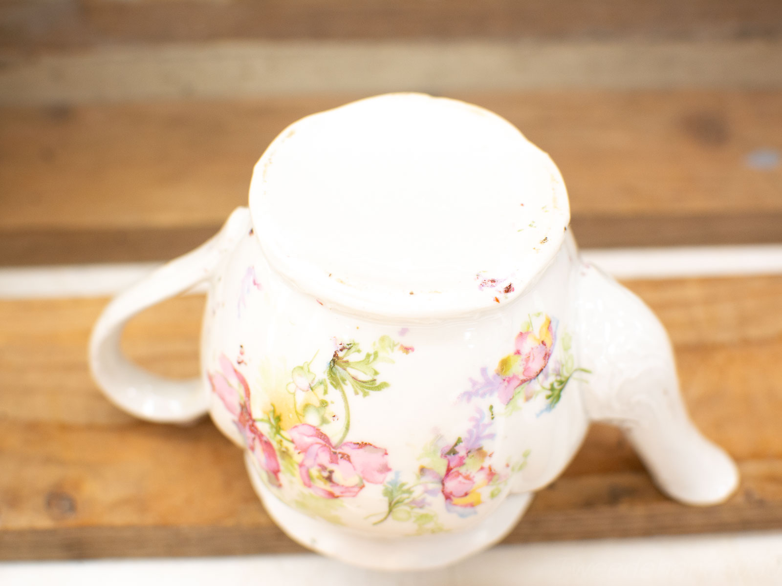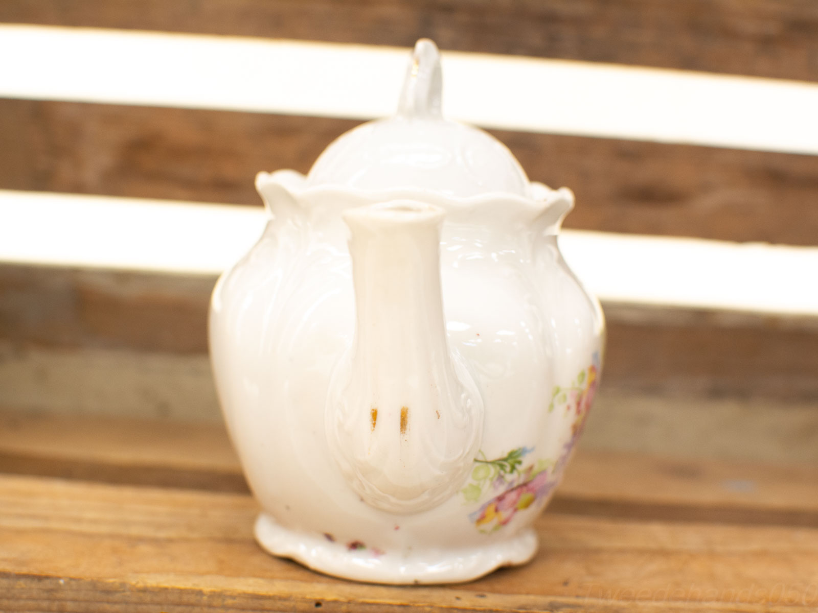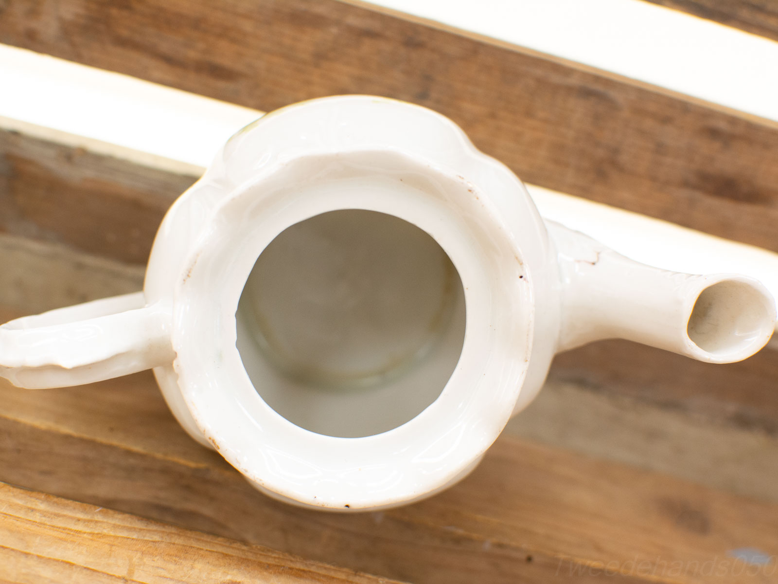 heeft wat bruine aanslag aan de binnenkant en aan de tuit gemeten van oor tot tuit 16 cm hoogte gemeten zinder deksel 8,5 cm
