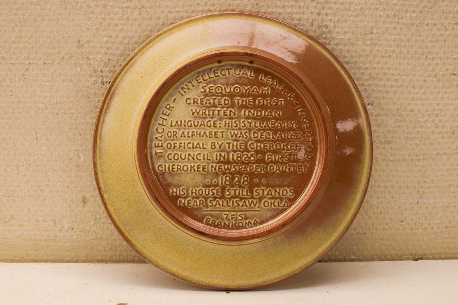 Dit porseleinen wandbord is een decoratief stuk met historische betekenis. Het bord heeft een diameter van 23 centimeter en een hoogte van 2,5 centimeter. De voorkant toont een reliëfrand met tekst rond Cherokee, terwijl de achterkant een gedetailleerde Engels tekstmedaillon bevat.