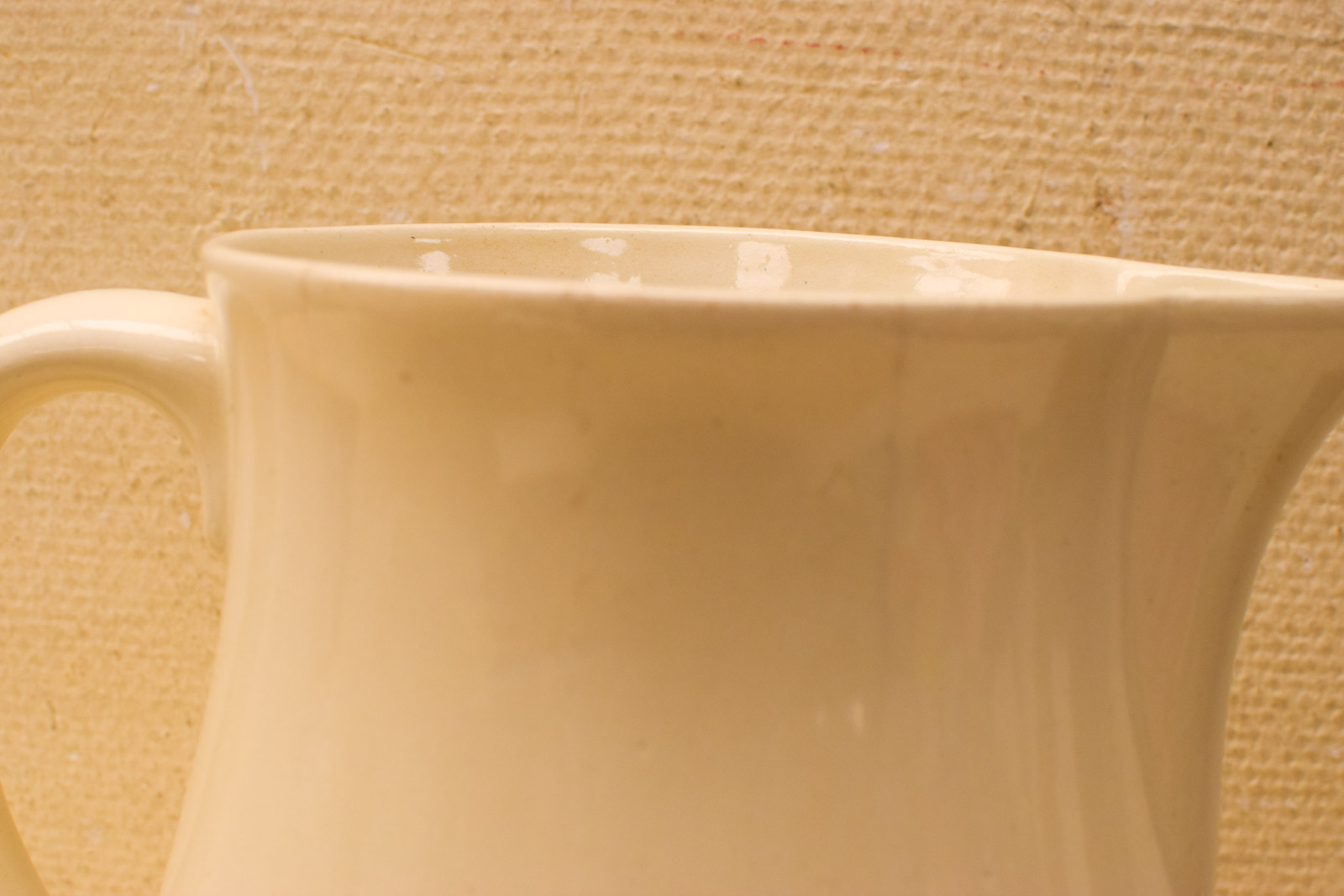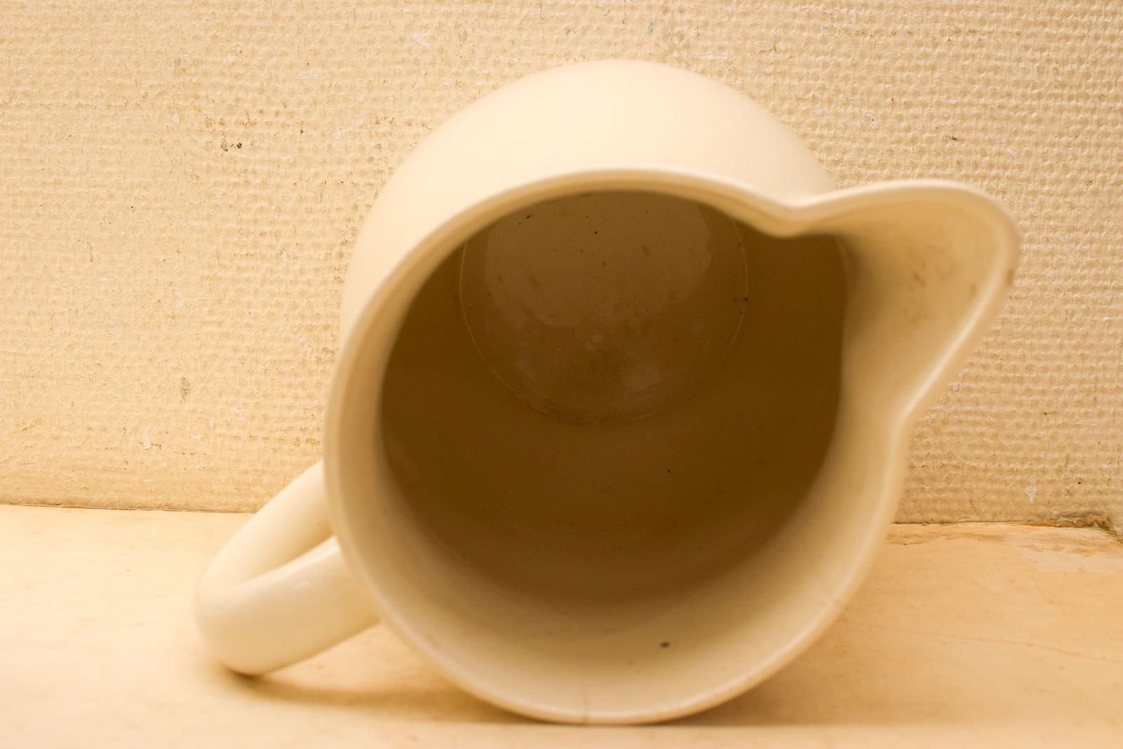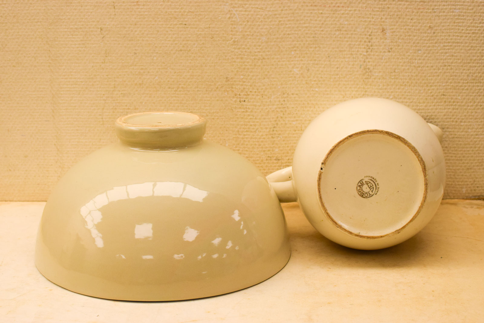 de waterkan heeft wat scheuren en aanslag aan de binnenkant gemeten van rand met tuit 21 cm hoog 26,5 cm de schaal heeft vlekken en krassen diameter bovenkant opening 33 cm hoog 17,5 cm
