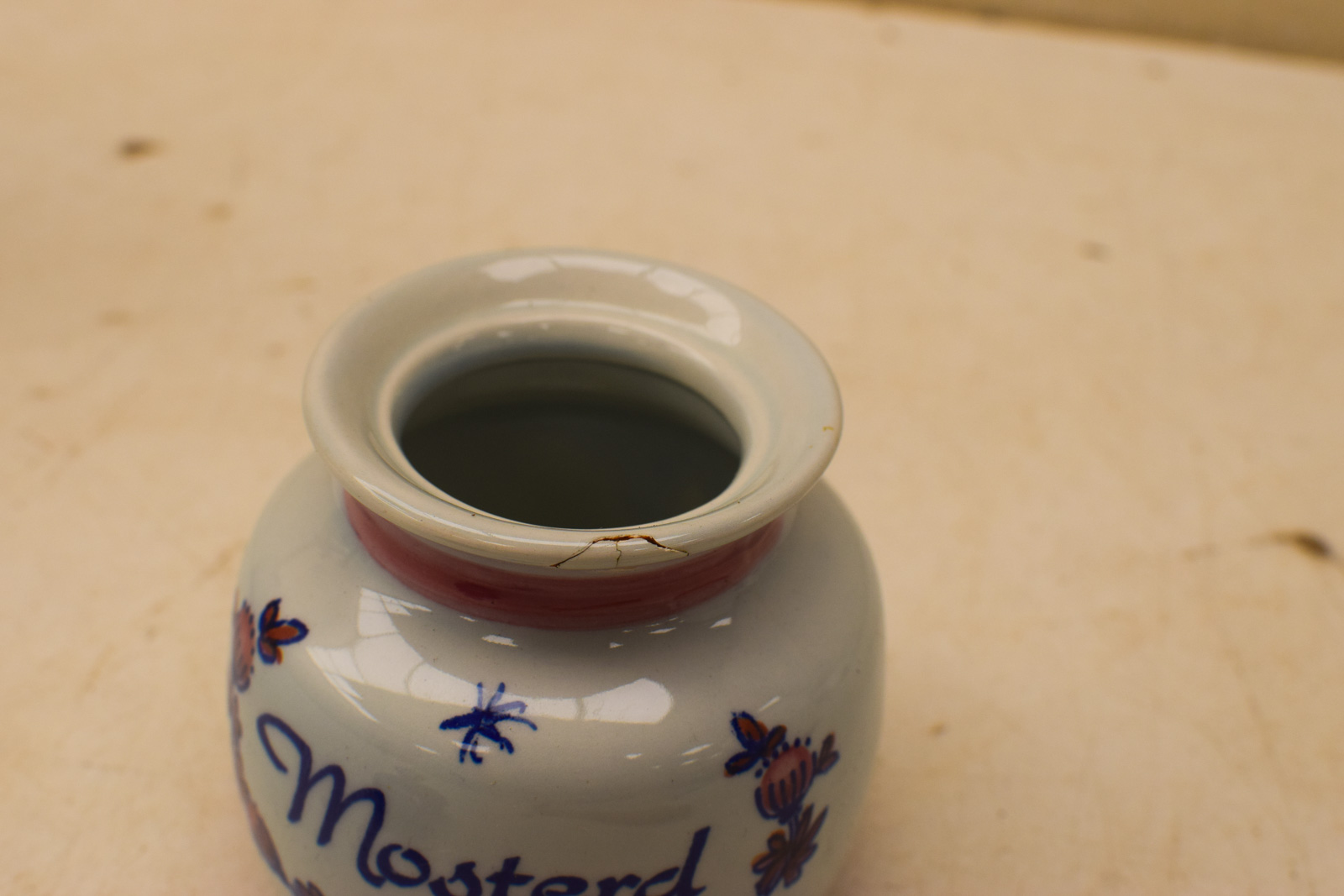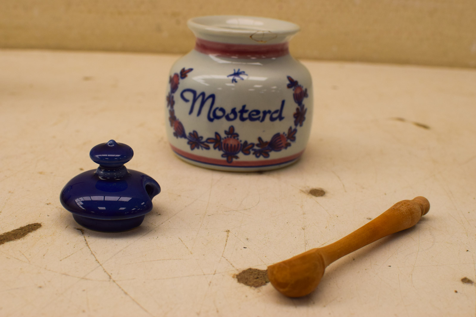 het mosterdpotje heeft een beschadiging op de rand zie foto verder zien ze er nog redelijk uit de mosterdpotje gemeten diameter bovenkant 5,5 cm gemeten zonder deksel hoog 7 cm de 2 grootste potjes gemeten diameter bovenkant opening 8,5 cm gemeten zonder deksel hoog 11,5 cm
